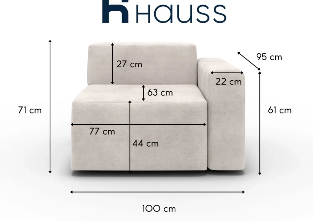 Ten modułowy element wypoczynkowy wyróżnia się wyjątkowym komfortem. Siedzisko wypełnione pianką HR i sprężynami falistymi gwarantuje wygodę codziennego relaksu oraz trwałość na lata. Dzięki solidnemu wykonaniu moduł sprawdzi się podczas rodzinnych spotkań, seansów filmowych czy popołudniowego odpoczynku.