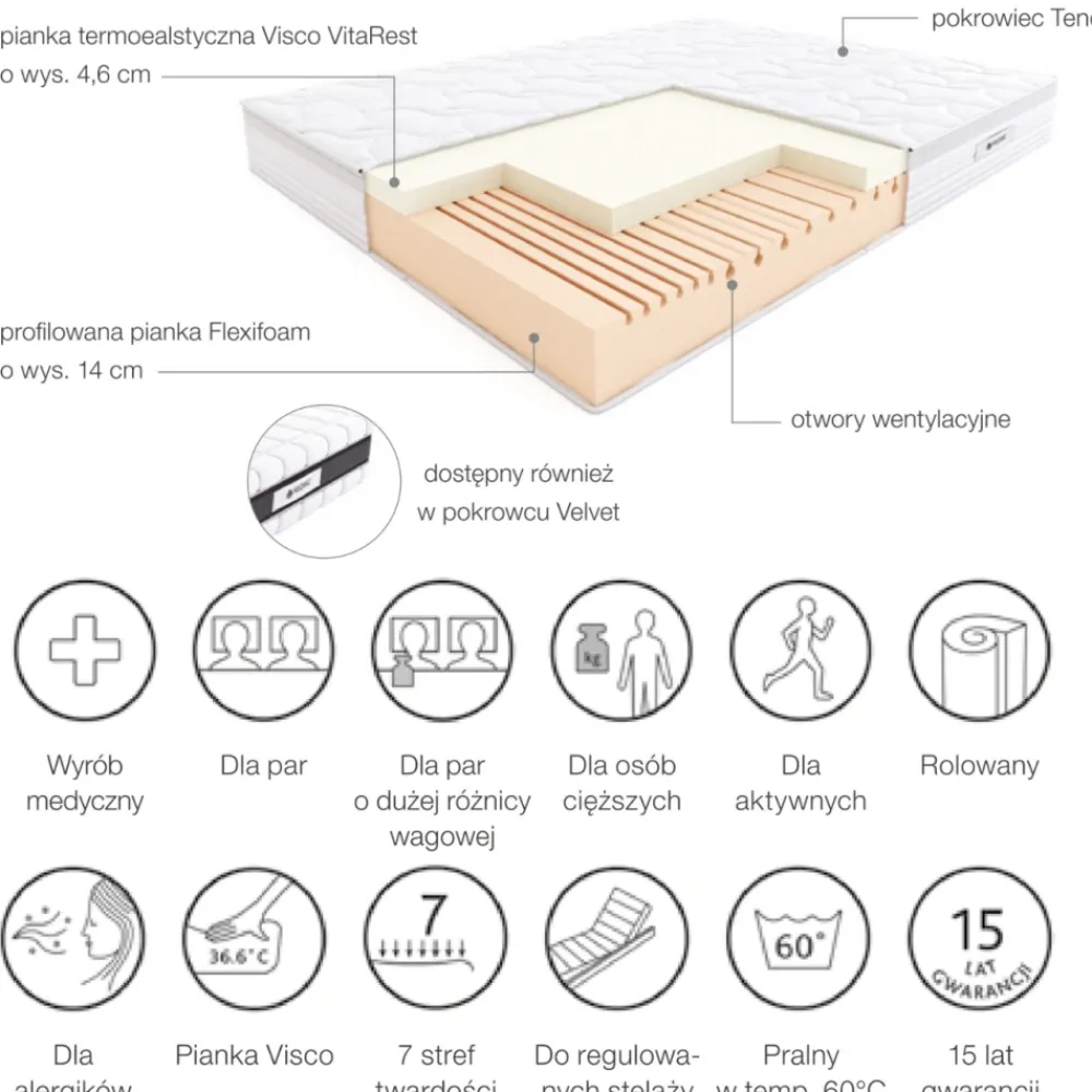 Wierzchnią warstwę tworzy pianka Visco, czyli wysokoelastyczna pianka termoelastyczna, która reaguje na temperaturę ciała. Dzięki temu materac idealnie dopasowuje się do Twojej sylwetki, zapewniając uczucie miękkości i przyjemnego otulenia.