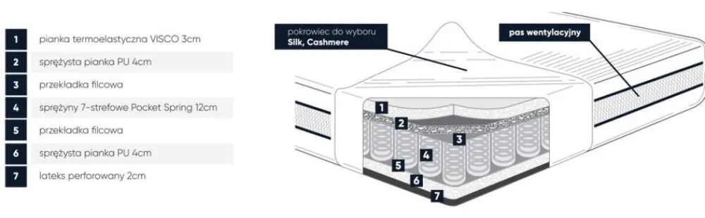 SILK – bardzo elegancka i jedwabiście miła w dotyku dzianina o pięknym wzorze i wysokiej gramaturze. Jej włókno doskonale kontroluje poziom wilgotności, a specjalna powłoka w technologii BI-OME zabezpiecza pokrowiec przed rozwojem drobnoustrojów, bakterii i pleśni. Odporny na odkształcenia i rozciąganie nawet po wielokrotnym praniu w 40 stopni Celsjusza.