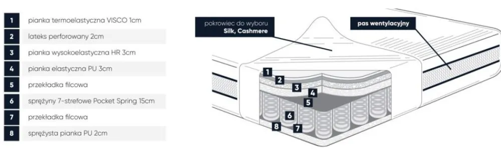 SILK – bardzo elegancka i jedwabiście miła w dotyku dzianina o pięknym wzorze i wysokiej gramaturze. Jej włókno doskonale kontroluje poziom wilgotności, a specjalna powłoka w technologii BI-OME zabezpiecza pokrowiec przed rozwojem drobnoustrojów, bakterii i pleśni. Odporny na odkształcenia i rozciąganie nawet po wielokrotnym praniu w 40 stopni Celsjusza.
