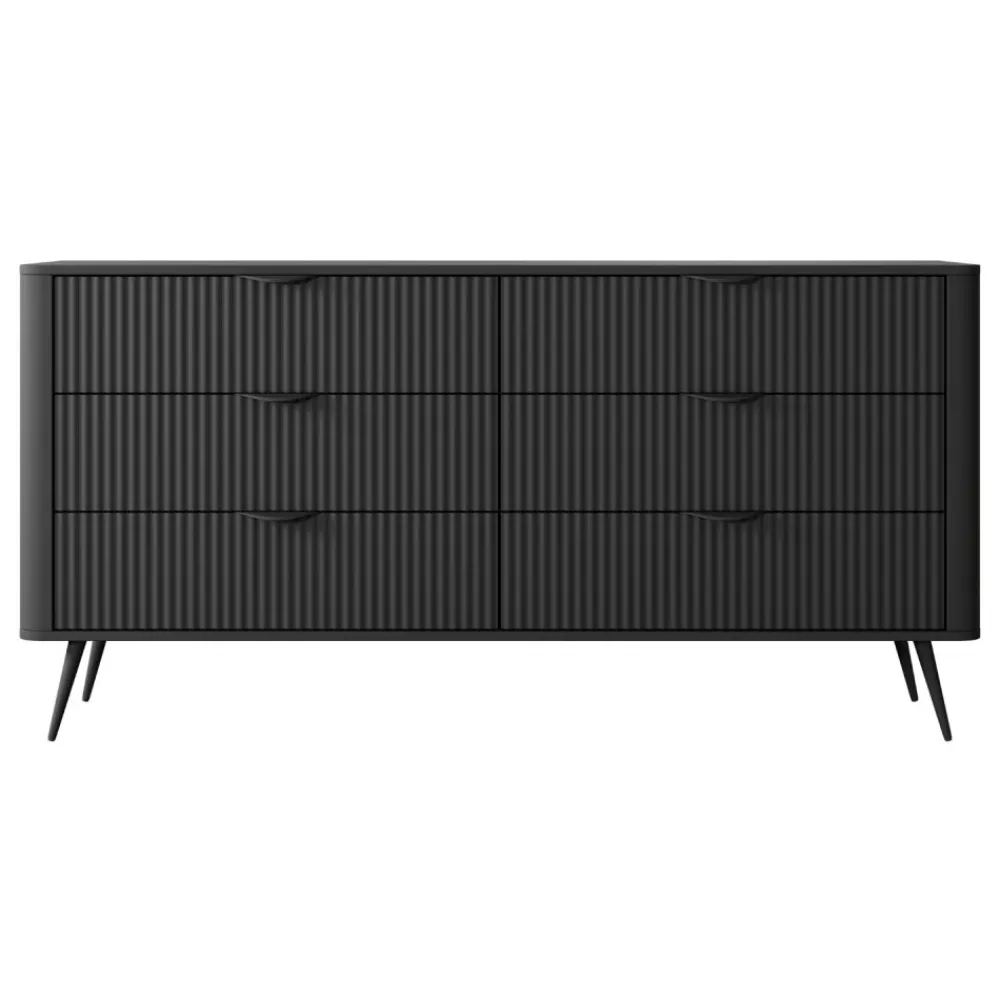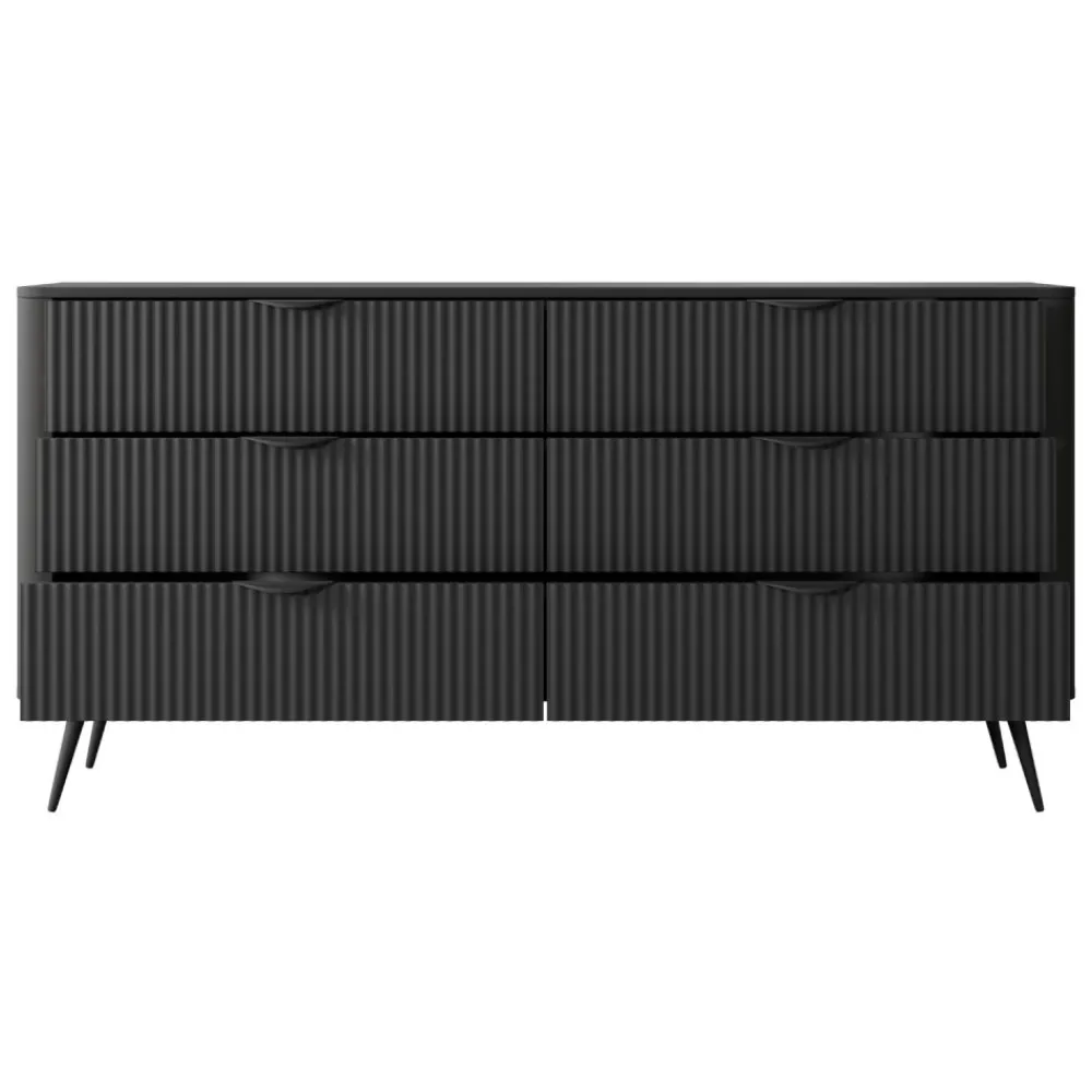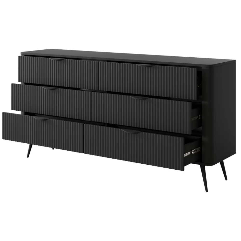 Model Lante 6S oferuje aż sześć pojemnych szuflad, które umożliwiają wygodne przechowywanie ubrań, dokumentów czy domowych akcesoriów. Wszystkie szuflady wyposażono w kulkowe prowadnice z pełnym wysuwem, co gwarantuje płynność działania i komfort codziennego użytkowania. Ryflowane fronty nadają meblowi unikalnego charakteru, a jednocześnie podkreślają jego wysoką jakość wykonania. Zaoblone listwy boczne z płyty MDF oraz obrzeża wykończone trwałym tworzywem ABS chronią mebel przed uszkodzeniami. Komoda łączy w sobie funkcjonalność i estetykę, co czyni ją doskonałym wyborem do nowoczesnych wnętrz. Przemyślany układ szuflad pomaga w zachowaniu porządku i organizacji przestrzeni.