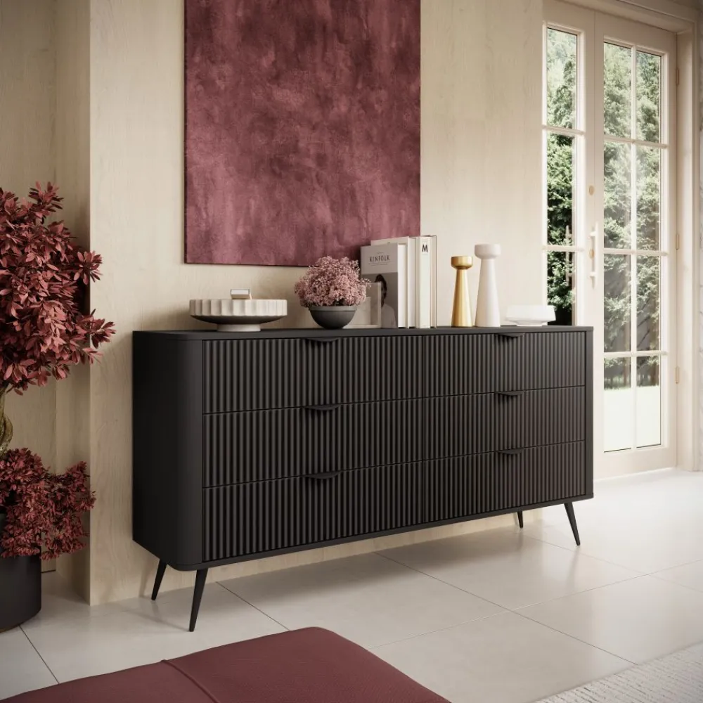 Komoda Lante 163 6S to idealna propozycja dla osób, które cenią minimalistyczny design z nutą luksusu. Jej czarna kolorystyka, ryflowane fronty z płyty MDF oraz zaoblone krawędzie tworzą harmonijną i elegancką formę. Subtelne, czarne uchwyty i smukłe, walcowane nogi dodają meblowi lekkości i nowoczesnego wyrazu. To komoda, która doskonale sprawdzi się w salonie, sypialni lub gabinecie, nadając wnętrzu szyku i głębi. Projekt kolekcji Lante to połączenie ponadczasowego stylu glamour z aktualnymi trendami wnętrzarskimi. Wybierając tę komodę, zyskujesz funkcjonalny i niezwykle estetyczny element wystroju.