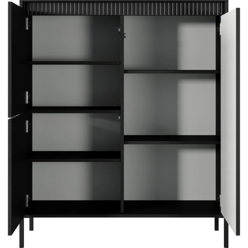 Komoda to nie tylko praktyczne miejsce do przechowywania, ale także elegancki element dekoracyjny Twojego salonu. Model prezentowany na zdjęciach wyróżnia się minimalistycznym stylem i nowoczesnym designem. Czarny korpus oraz front wykonane z laminowanej płyty wiórowej E05 i MDF o grubości 16-18 mm gwarantują trwałość oraz estetyczny wygląd. Brak uchwytów i system otwierania push-to-open nadają meblowi wyjątkową lekkość i elegancję.
