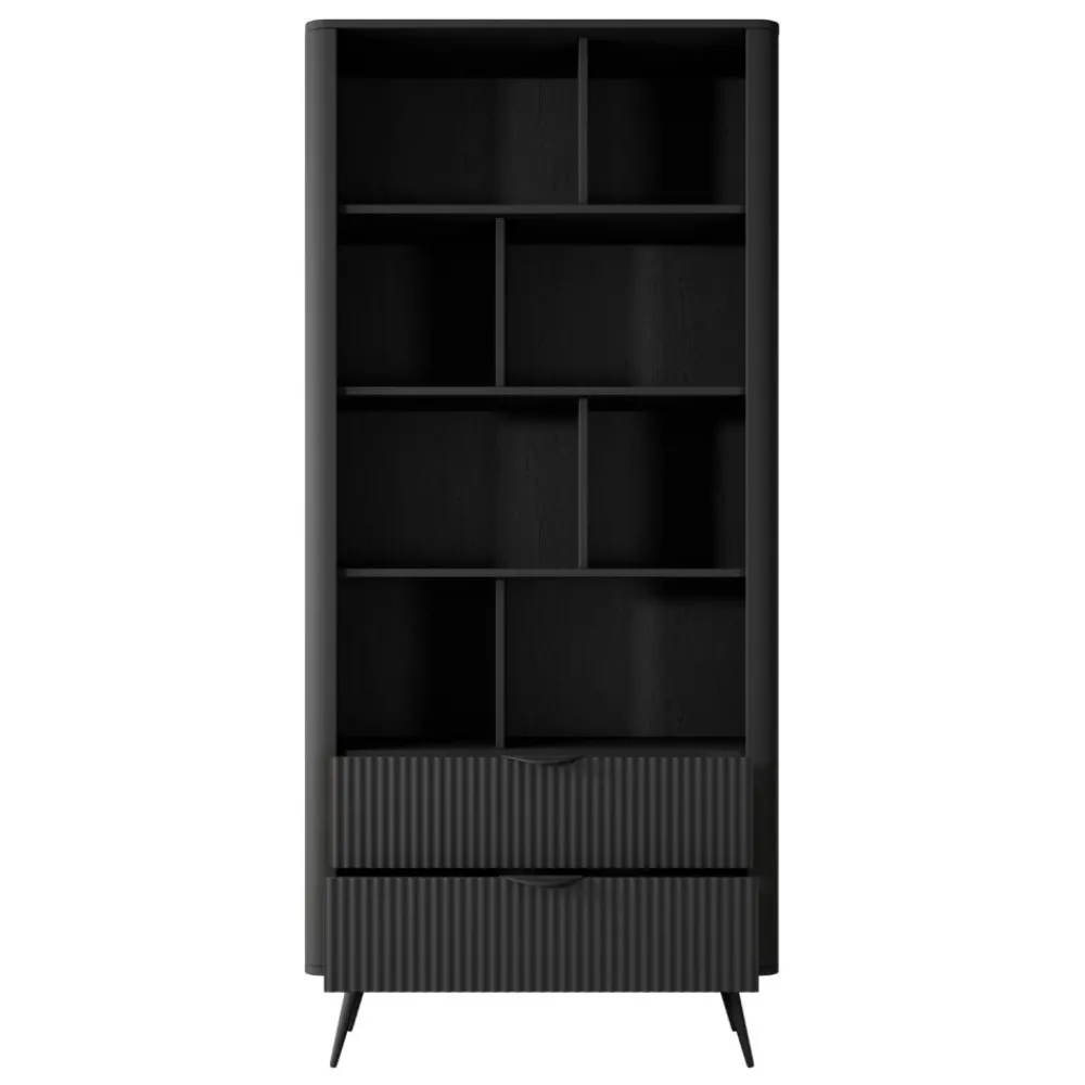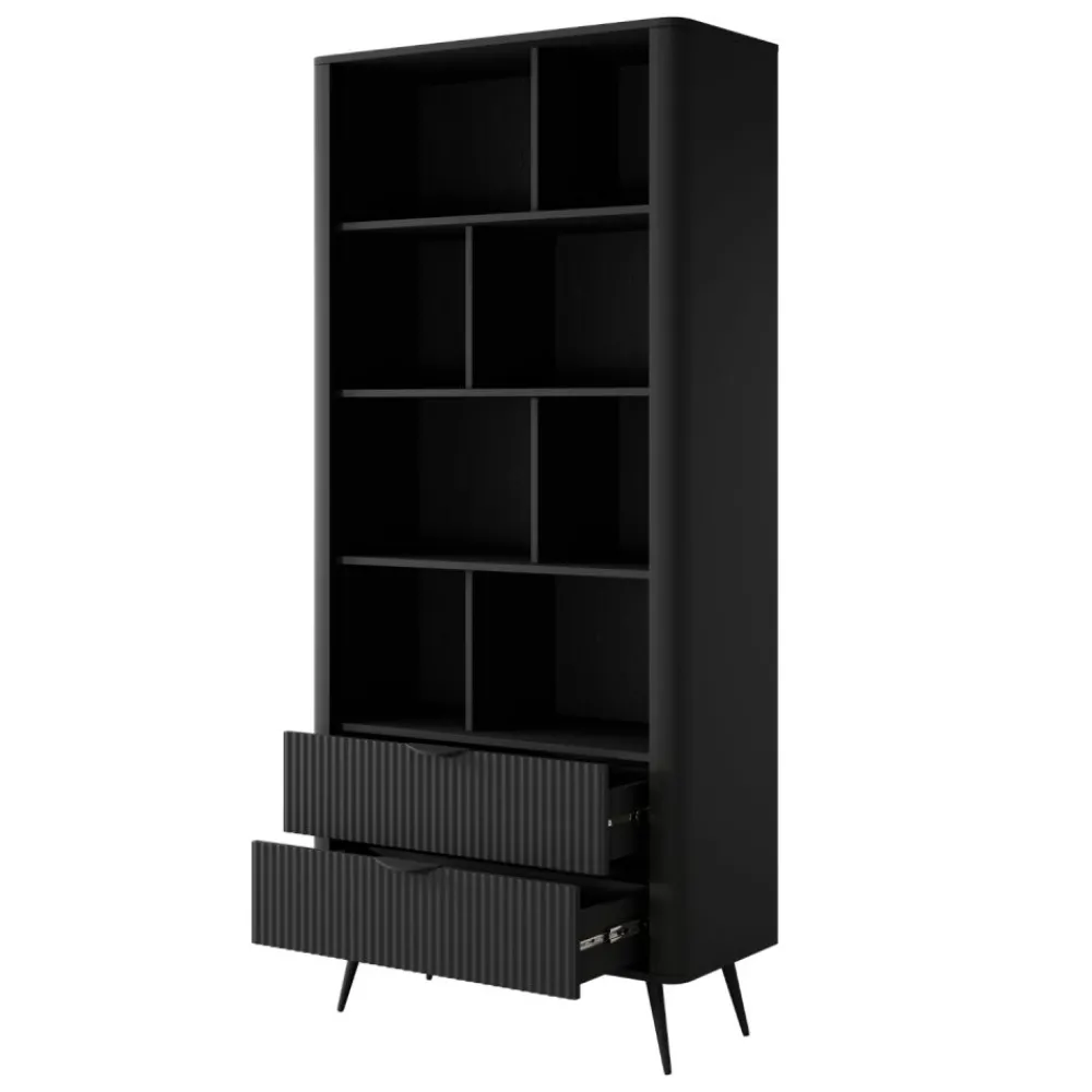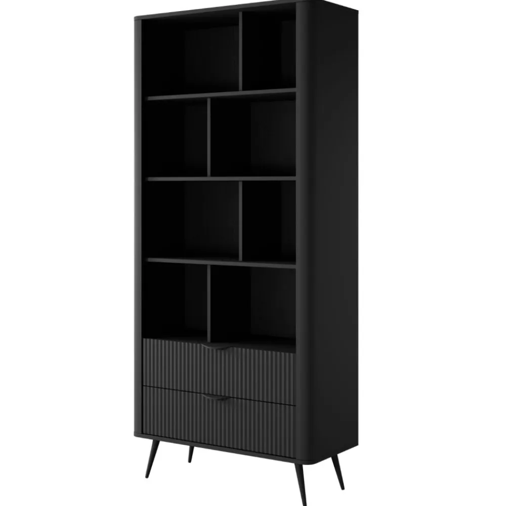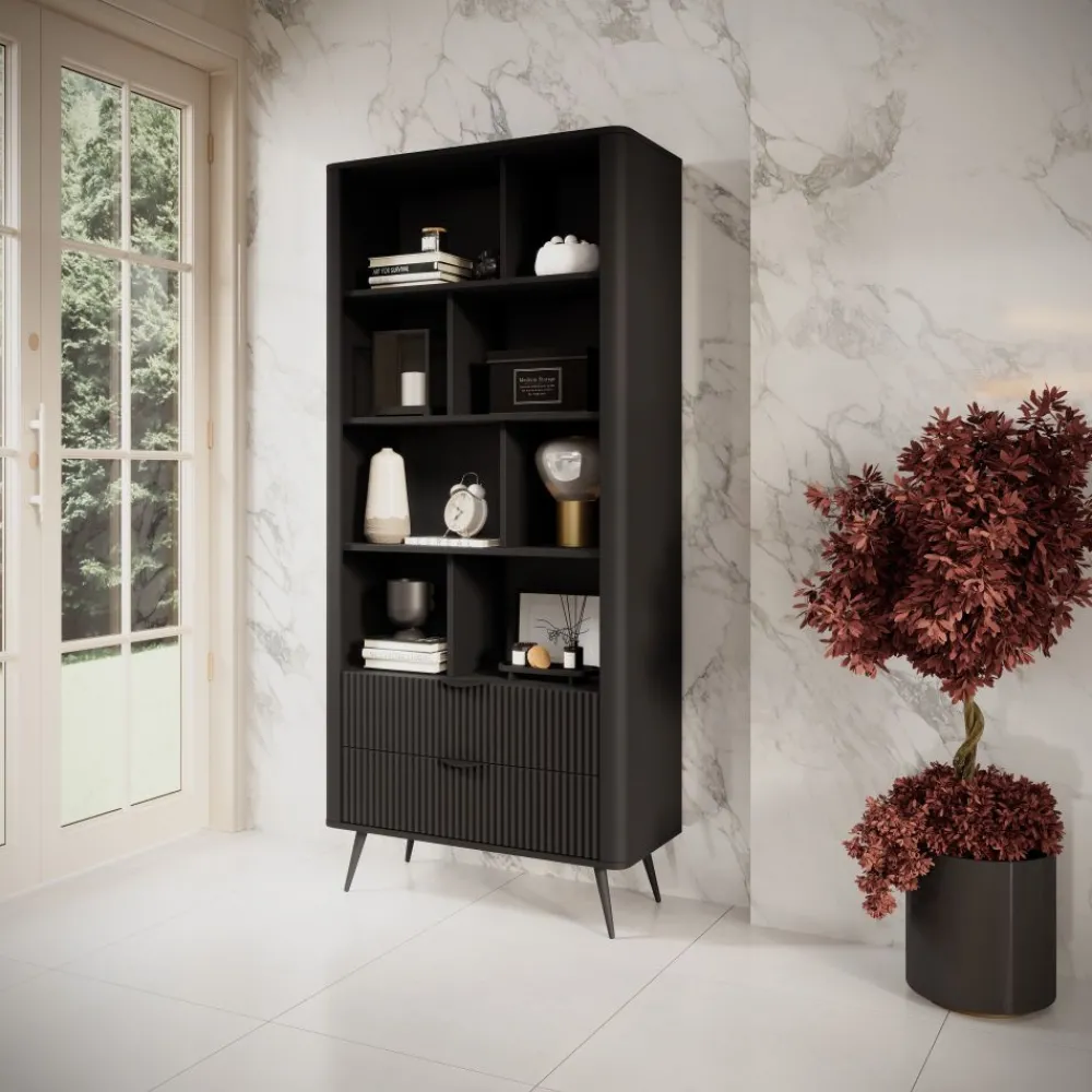 Regał otwarty Lante to mebel, który wnosi do wnętrza klasę, spokój i estetyczną harmonię. Czarna kolorystyka, oraz czarne tło tylnej ściany o strukturze drewna i delikatne, ryflowane fronty tworzą wyjątkowy, nowoczesny charakter z nutą stylu glamour. Zaoblone krawędzie oraz smukłe, metalowe nogi w czarnym wykończeniu dodają konstrukcji lekkości i elegancji. Regał idealnie sprawdzi się w salonie, sypialni, biurze lub domowej bibliotece, pełniąc zarówno funkcję praktyczną, jak i dekoracyjną. Kolekcja Lante to połączenie modnego designu z wysmakowaną estetyką – idealna dla osób, które szukają stylowych, ale funkcjonalnych rozwiązań. Dzięki neutralnym barwom mebel łatwo dopasować do różnych aranżacji wnętrz.