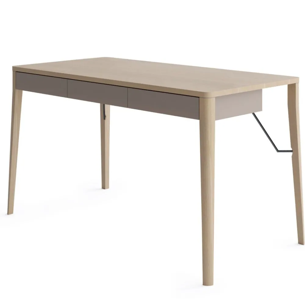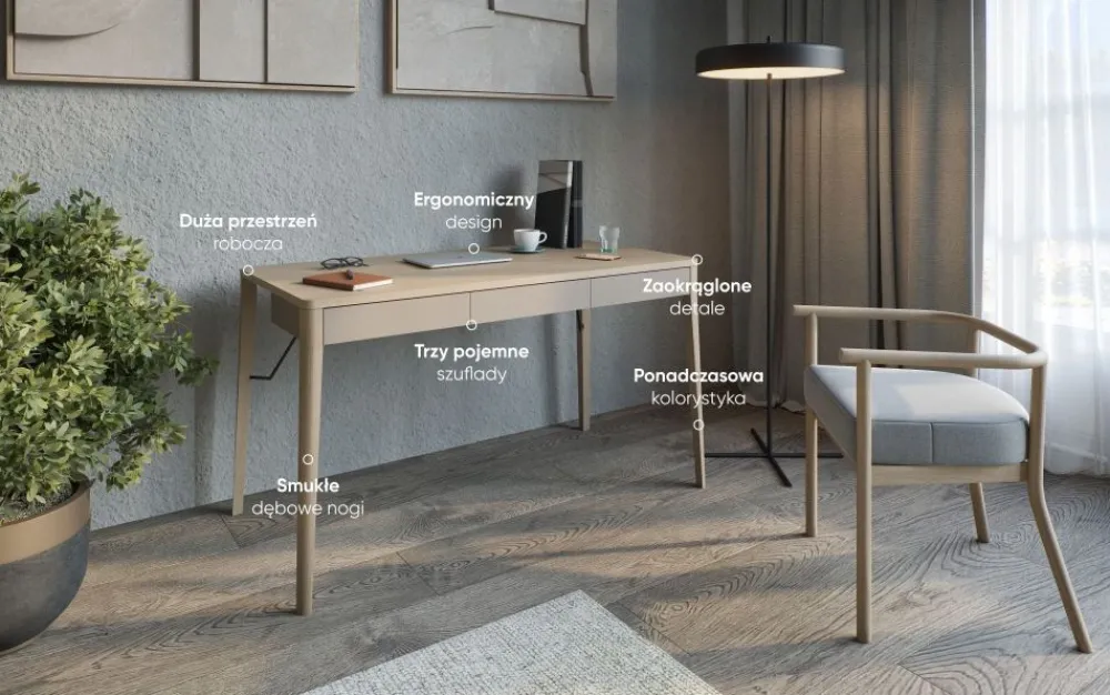 To biurko do pokoju to wyjątkowe połączenie funkcjonalności i stylu, które sprawdzi się zarówno jako miejsce do pracy, jak i toaletka w sypialni czy pokoju dziennym. Dębowe nogi nadają meblowi solidności, a jednocześnie naturalnego charakteru, który idealnie pasuje do różnych stylów wnętrzarskich. Trzy szuflady pod blatem oferują praktyczne miejsce na przechowywanie, pomagając utrzymać porządek na blacie. Kolorystyka w odcieniach beżu i dębu jasnego wprowadza do wnętrza spokój i harmonię, doskonale pasując do nowoczesnych aranżacji. To biurko-toaletka, które dzięki swojemu wszechstronnemu designowi będzie nieodzownym elementem każdego wnętrza.