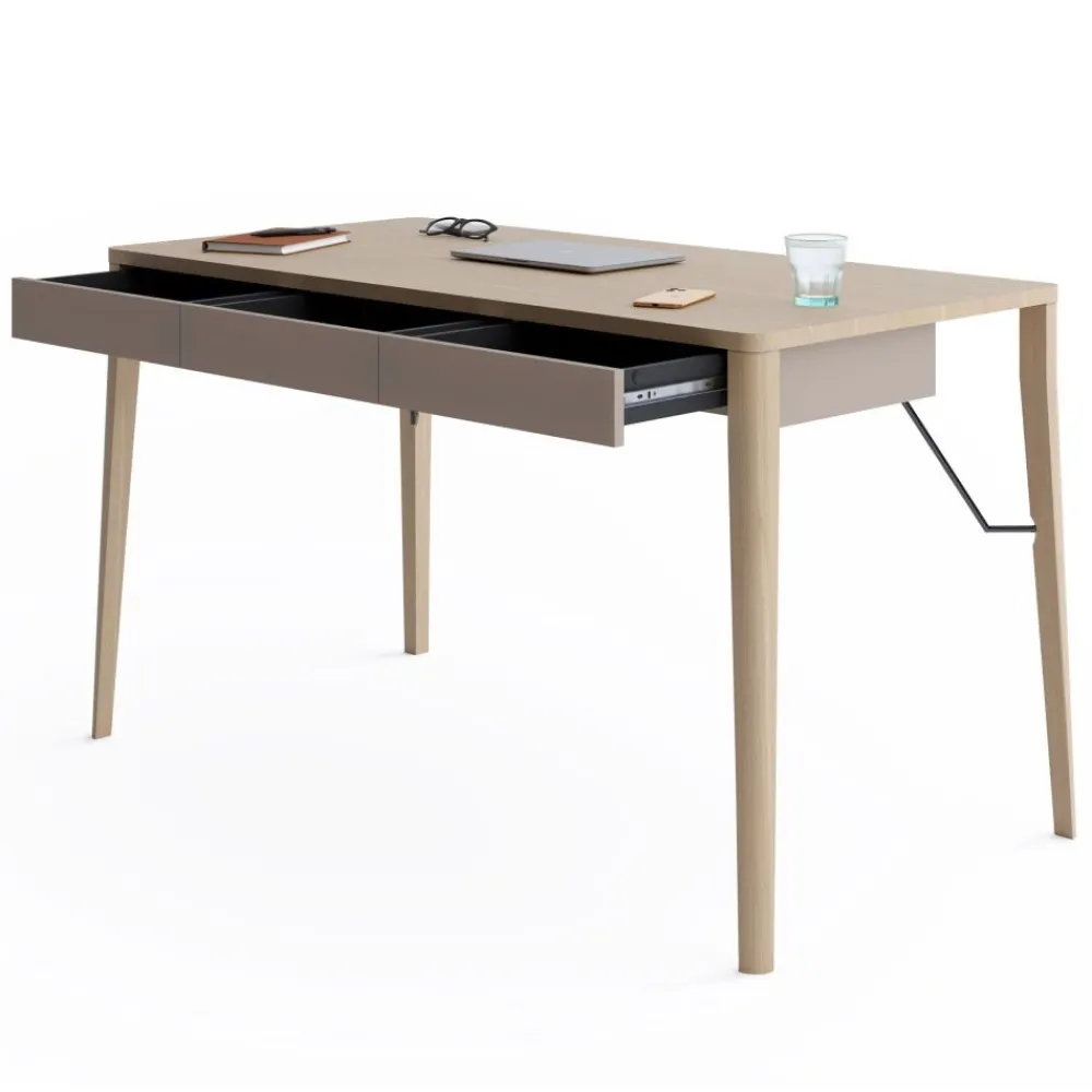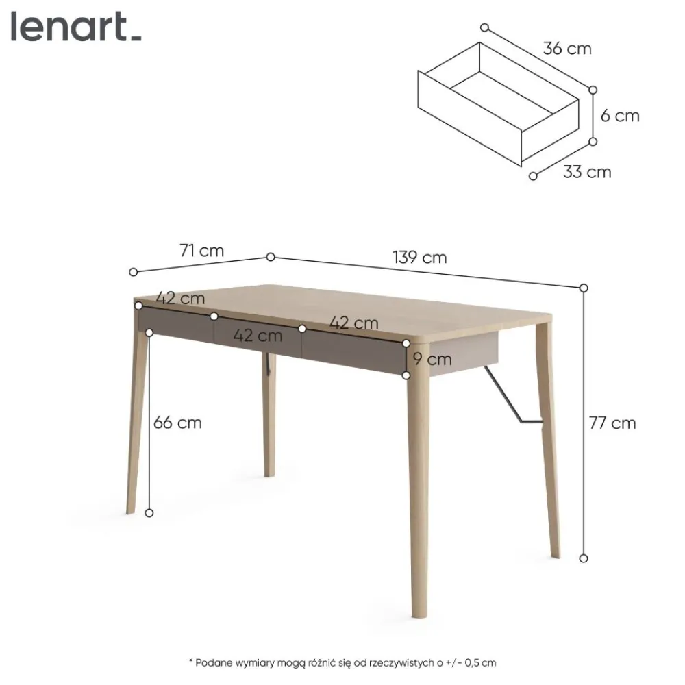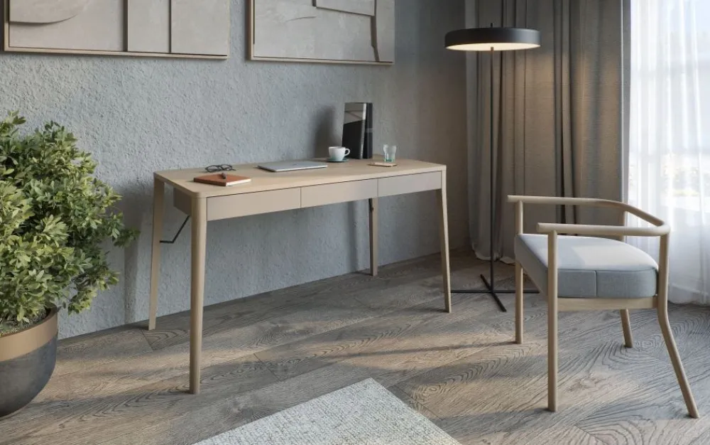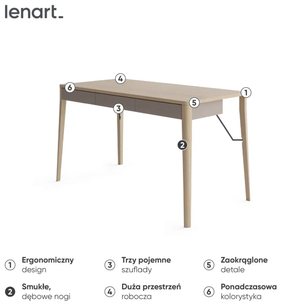 Biurko Lenart MATCH MK-01 to nowoczesne biurko, które doskonale łączy skandynawski styl z praktycznością. Wykonane z drewna dębowego i laminowanej płyty wiórowej w kolorach beż i dąb jasny, wprowadza do wnętrza ciepło i elegancję. Długość 139 cm i głębokość 71 cm zapewniają komfortową przestrzeń do pracy, a wysokość 77 cm jest idealna do codziennego użytkowania. Trzy pojemne szuflady umieszczone pod blatem oferują miejsce na przechowywanie dokumentów, akcesoriów biurowych lub innych niezbędnych rzeczy. To biurko z dębowymi nogami, które sprawdzi się w każdym nowoczesnym biurze czy pokoju, łącząc estetykę z wygodą.