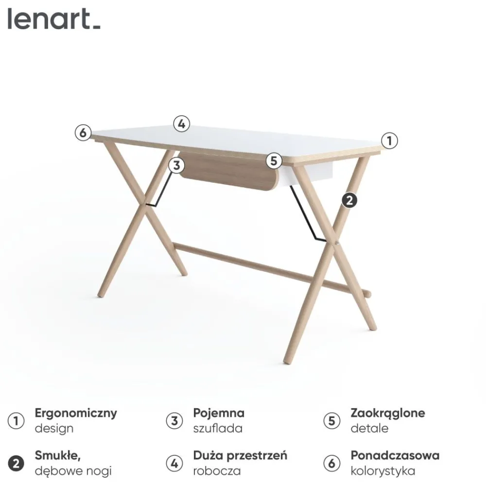 Biurko skandynawskie Lenart MATCH MW-01 to mebel, który zachwyca swoją prostotą i dbałością o detale. Dębowe nogi nadają mu solidności, a jednocześnie wprowadzają ciepło i naturalny charakter, charakterystyczny dla skandynawskiego stylu. Blat i front szuflady wykończone laminatem w kolorach białym i dąb jasny doskonale komponują się z dębowymi elementami, tworząc spójną i harmonijną całość. Okleina ABS na krawędziach blatu i szuflady zapewnia trwałość, dzięki czemu biurko jest odporne na codzienne użytkowanie. To biurko skandynawskie to idealny wybór dla osób, które szukają stylowego, a jednocześnie trwałego mebla do swojego wnętrza.