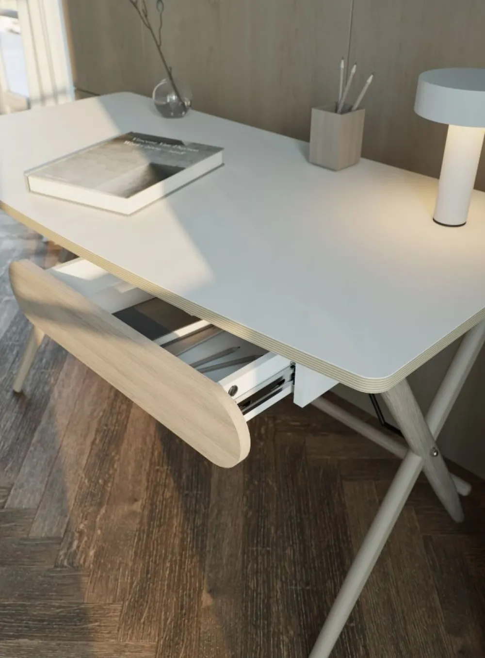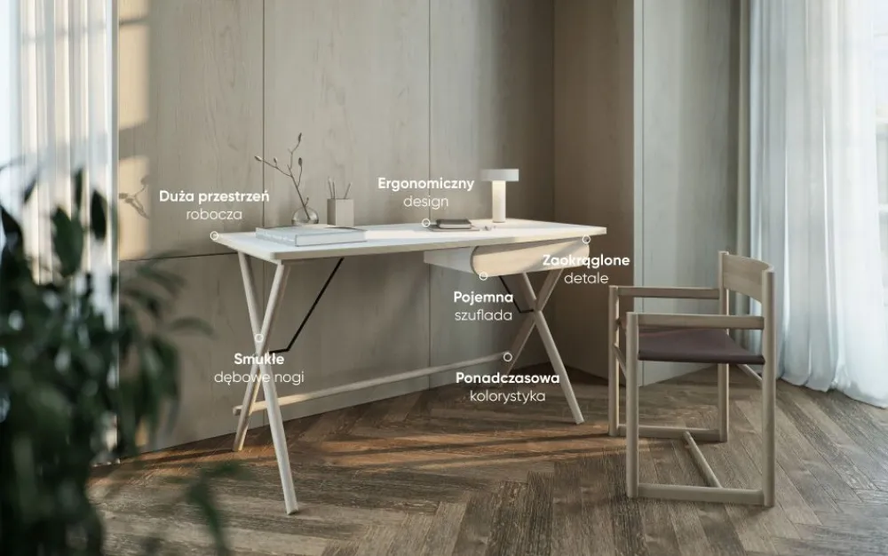 To biurko do pokoju to doskonałe rozwiązanie, które sprawdzi się zarówno jako miejsce do pracy, jak i toaletka w sypialni czy pokoju dziennym. Dzięki swojej wszechstronności i nowoczesnemu designowi, biurko pasuje do różnych pomieszczeń, dodając im skandynawskiego uroku. Dębowe nogi i solidne wykonanie sprawiają, że jest to mebel trwały i wytrzymały, gotowy na intensywne użytkowanie. Szuflada z owalnym frontem dodaje biurku unikalnego charakteru, a jednocześnie zapewnia praktyczne przechowywanie drobiazgów. To biurko-toaletka, które dzięki swojej funkcjonalności i estetyce stanie się nieodzownym elementem każdego wnętrza.