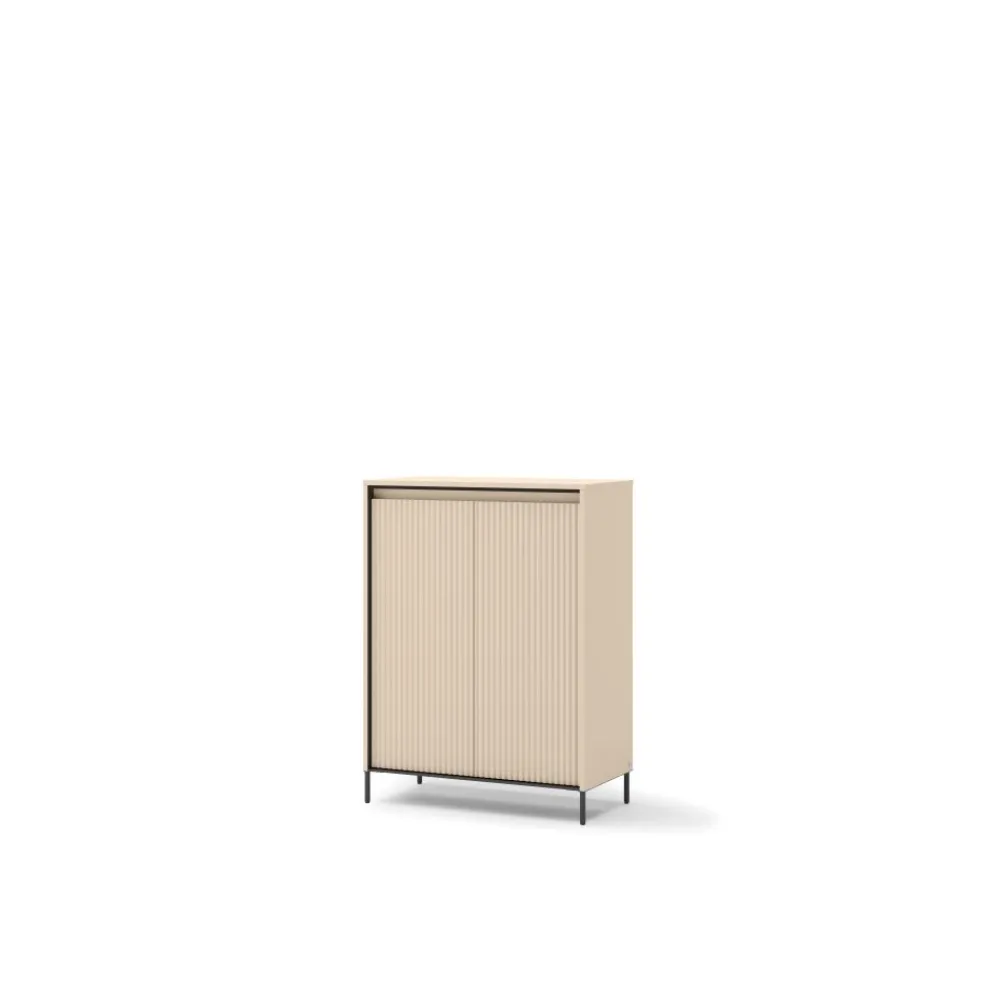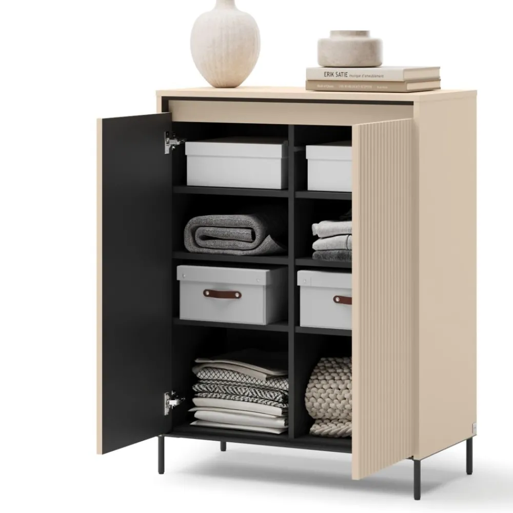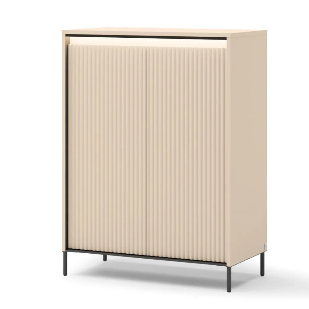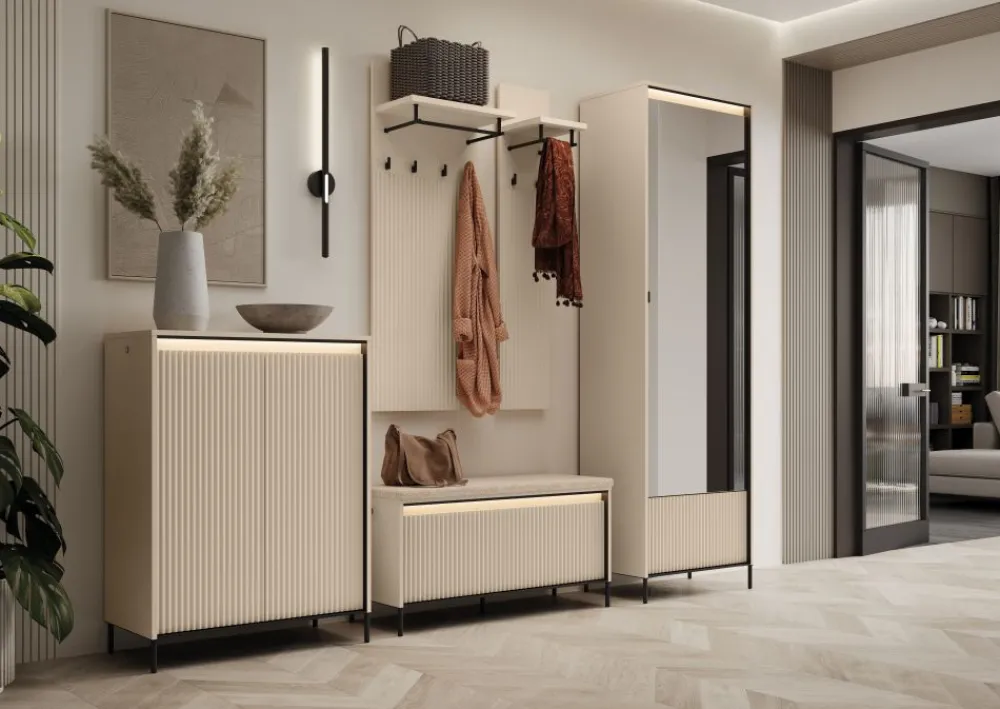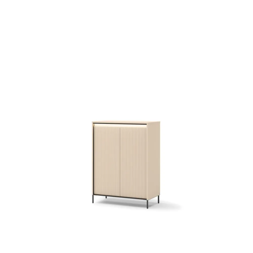 Za eleganckimi lamelami kryje się w pełni funkcjonalna szafka za lamelami, która ułatwia organizację przestrzeni i utrzymanie porządku. Dwie drzwi otwierają się za pomocą systemu push-open, co eliminuje konieczność użycia uchwytów i nadaje komodzie lekkości. Wnętrze szafki zaprojektowane zostało z myślą o przechowywaniu różnorodnych rzeczy – od odzieży, przez akcesoria, aż po dokumenty. Oświetlenie LED nie tylko ułatwia korzystanie z mebla, ale również wprowadza przyjemną atmosferę. To połączenie estetyki i użyteczności, idealne do nowoczesnych przestrzeni. Dzięki eleganckiemu frontowi, mebel równie dobrze sprawdzi się w salonie, jak i w garderobie.
