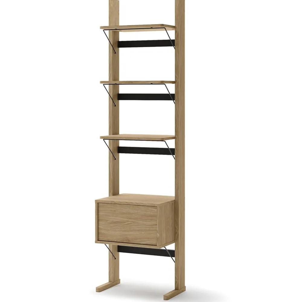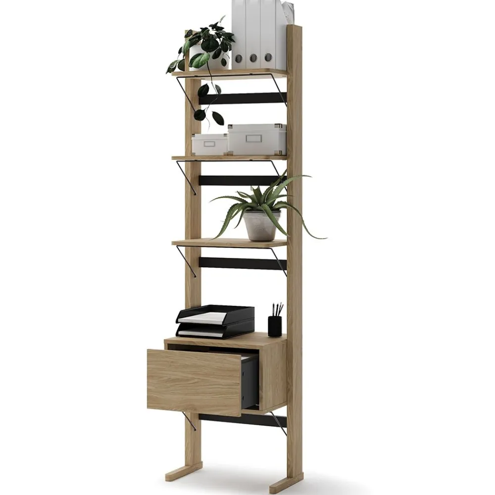 Ten regał do biura to świetna propozycja dla osób, które cenią porządek i estetykę w miejscu pracy. Dzięki swojej wąskiej budowie, regał łatwo zmieści się nawet w niewielkim gabinecie lub biurze domowym. Pięć funkcjonalnych półek pomieści dokumenty, segregatory i artykuły biurowe. Czarna tylna ściana i elegancki front w kolorze dębu olejowanego wpisują się w nowoczesne aranżacje biurowe. Konstrukcja oparta na płycie wiórowej laminowanej zapewnia stabilność i długowieczność mebla. Montaż jest prosty i intuicyjny, co sprawia, że szybko można cieszyć się jego pełną funkcjonalnością.