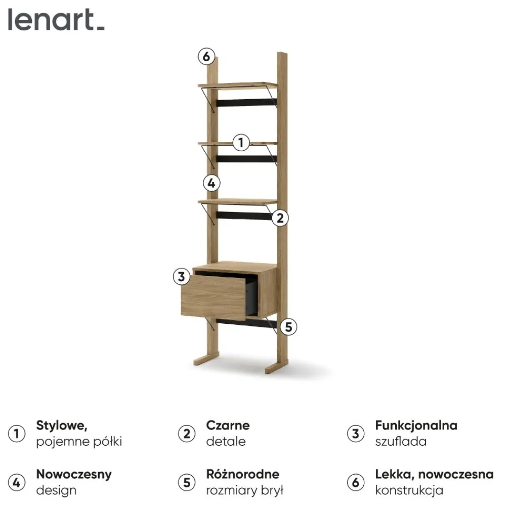 Regał Lenart OLLIE OL-01 to idealny regał do pokoju młodzieżowego lub dziennego, gdzie liczy się każdy centymetr przestrzeni. Dzięki wąskiej konstrukcji świetnie sprawdzi się nawet w mniejszych wnętrzach. Pięć pojemnych półek oraz dwoje drzwi pozwalają na przechowywanie książek, dekoracji i przedmiotów codziennego użytku. Kolor dąb olejowany w połączeniu z czarnymi elementami nadaje wnętrzu nowoczesnego charakteru. Solidna płyta laminowana oraz wykończenie ABS zapewniają trwałość i odporność na codzienne użytkowanie. To mebel, który doskonale łączy funkcjonalność z atrakcyjnym wyglądem.
