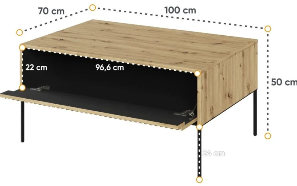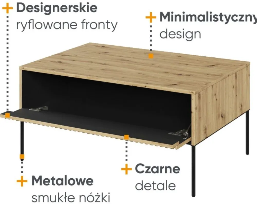 Zaprojektowany z myślą o wygodzie, posiada przestronną półkę, która pomieści wszystkie potrzebne przedmioty – od czasopism i książek po piloty telewizyjne czy dekoracje. Dzięki temu będziesz mieć ulubione rzeczy zawsze pod ręką, a Twój salon będzie zawsze uporządkowany i stylowy.