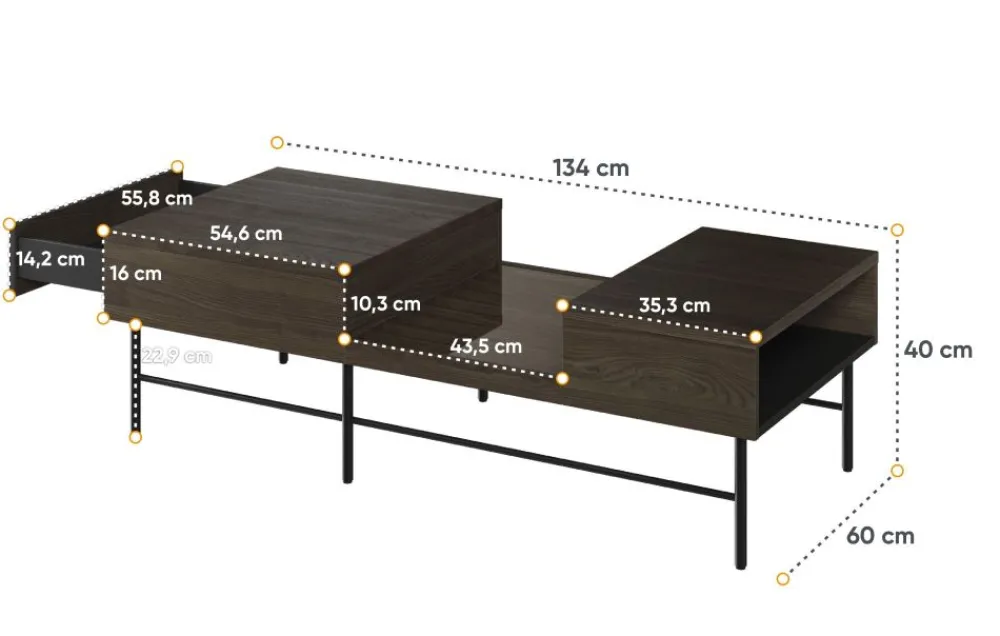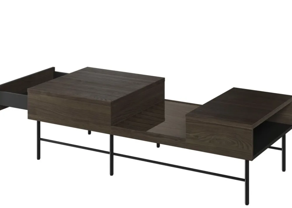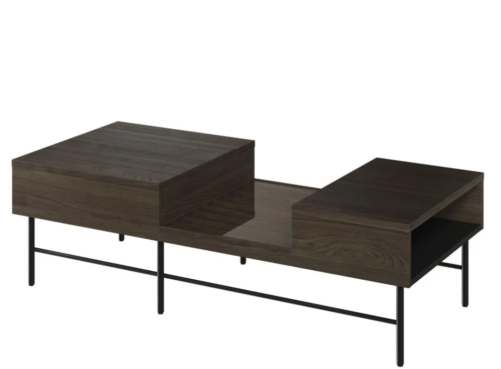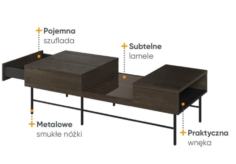 Ten stylowy stolik kawowy posiada solidne, metalowe nóżki, które gwarantują stabilność i trwałość. Wykonany z najwyższej jakości materiałów, z pewnością zachwyci nawet najbardziej wymagających klientów. Lamele umieszczone na blacie dodają mu niepowtarzalnego uroku, jednocześnie stanowiąc interesujący detal dekoracyjny.