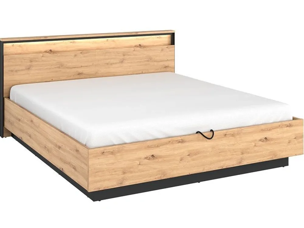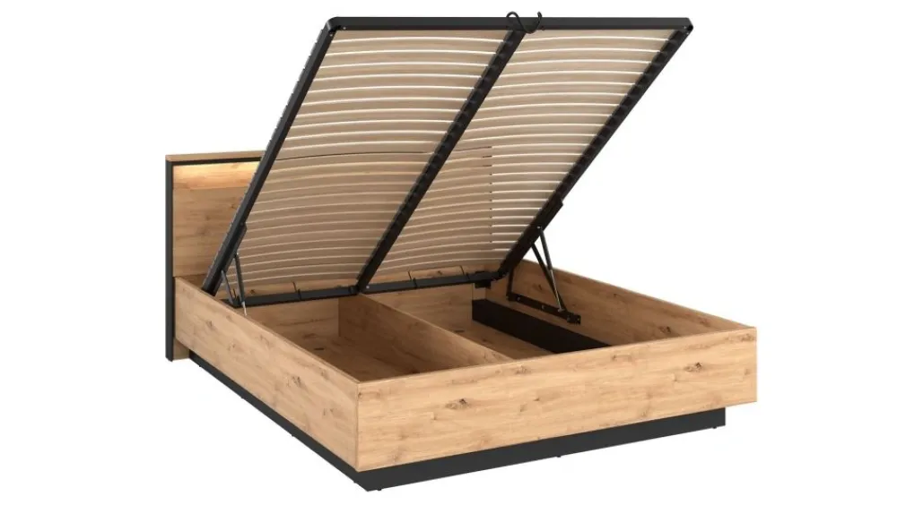Łóżko z kolekcji Quant sypialnia posiada pojemnik na pościel oraz stelaż szczebelkowy metalowy. Ponadto wyposażone jest w zagłówek oraz ledowe oświetlenie. Łóżko idealnie sprawdzi się w Twojej sypialni. Mebel wykonano z wytrzymałej płyty laminowanej.