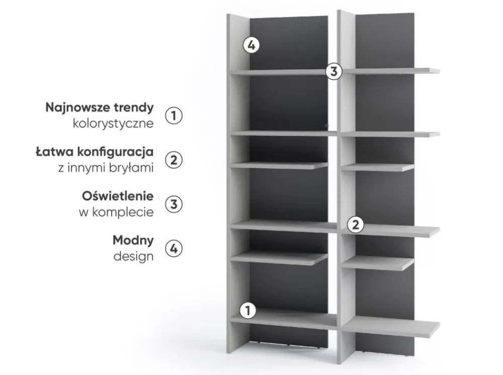 Regał Fitt charakteryzuje się minimalistycznym, nowoczesnym designem, który wprowadza do wnętrza elegancję i styl. Szary kolor jest nie tylko modny, ale również uniwersalny, co pozwala na łatwe dopasowanie do różnych aranżacji wnętrz.