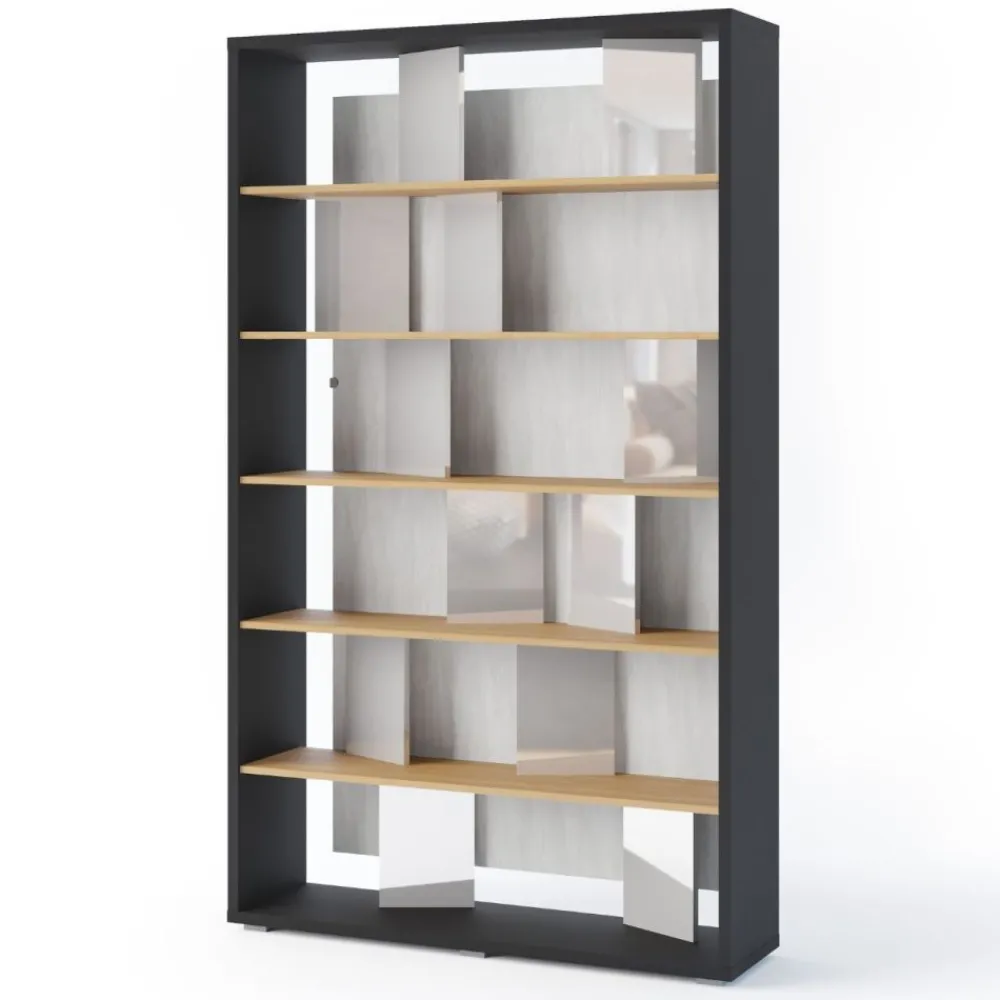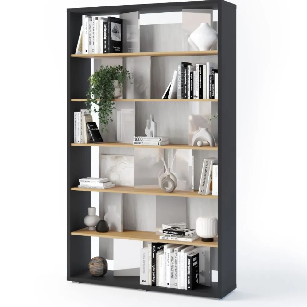 Połączenie koloru szarego, grafitowego oraz dębu linearnego sprawia, że regał Fitt doskonale wpasuje się w różne aranżacje wnętrz, dodając im nowoczesnego charakteru.