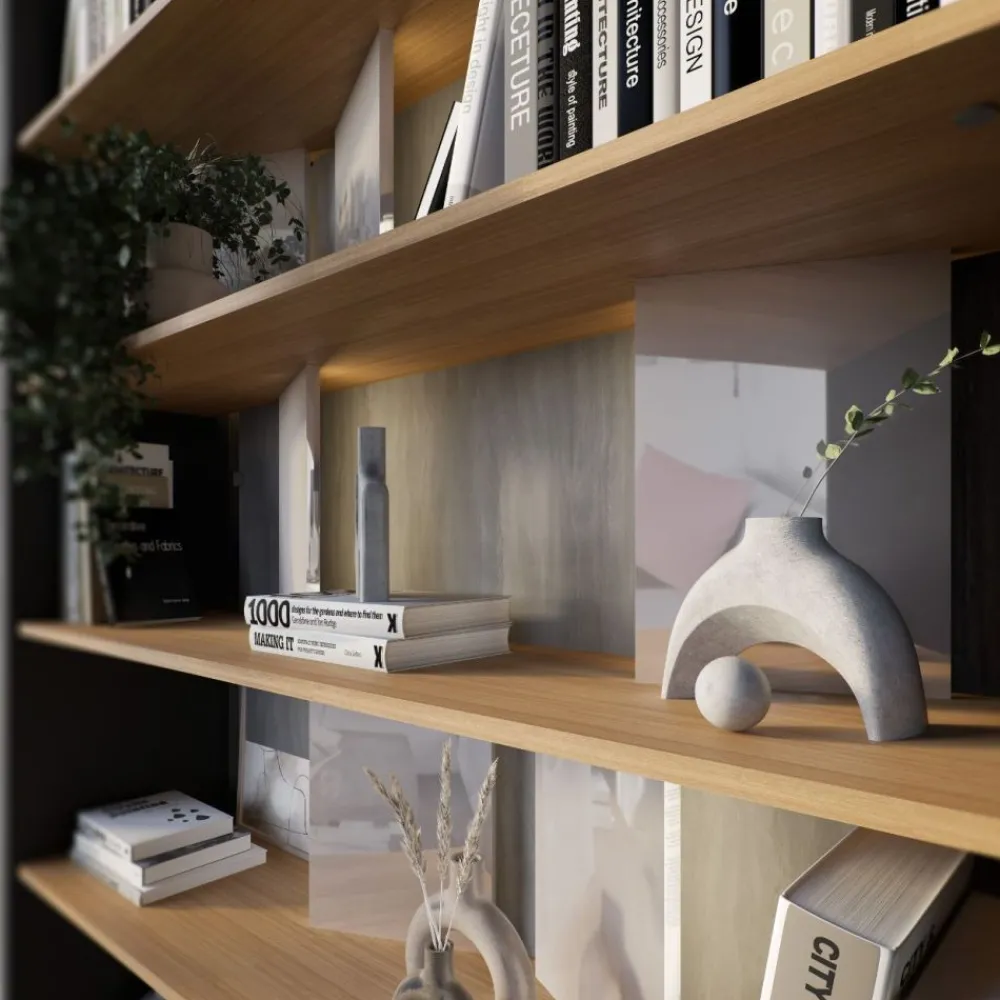 Regał Fitt oferuje mnóstwo przestrzeni do przechowywania. Liczne półki i przegródki pozwalają na łatwą organizację książek, dekoracji, dokumentów czy innych drobiazgów, dzięki czemu Twój dom zawsze będzie wyglądał schludnie i nowocześnie. Wbudowane oświetlenie LED dodaje regałowi niepowtarzalnego uroku, podkreślając jego zawartość i tworząc przytulną atmosferę w pomieszczeniu. To nie tylko praktyczne rozwiązanie, ale również dodatkowy element dekoracyjny.
