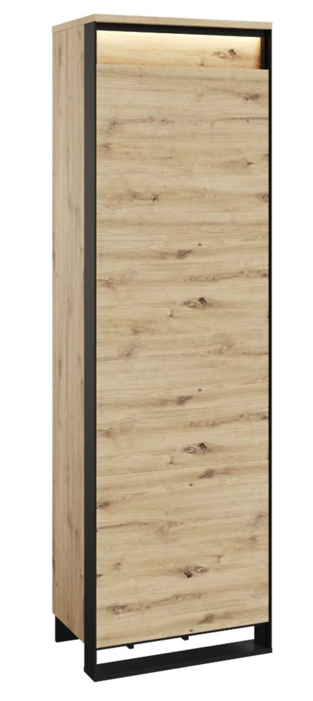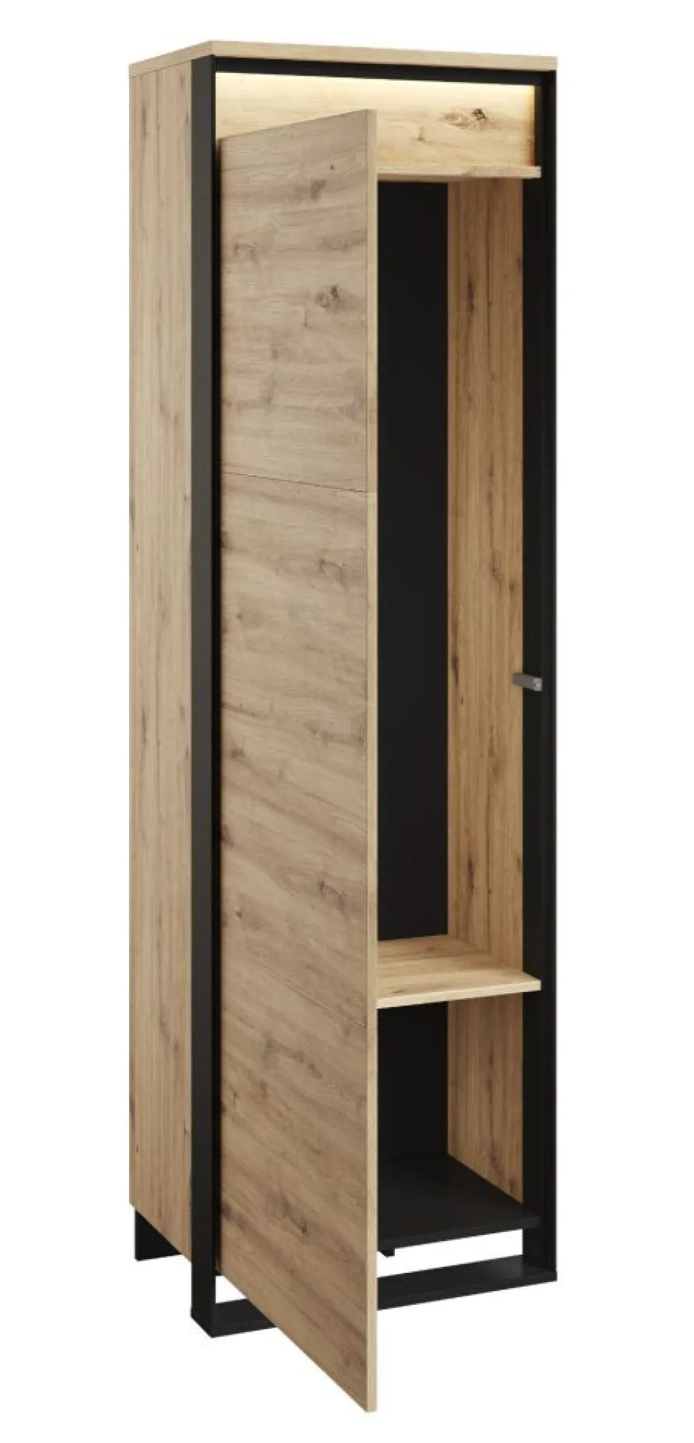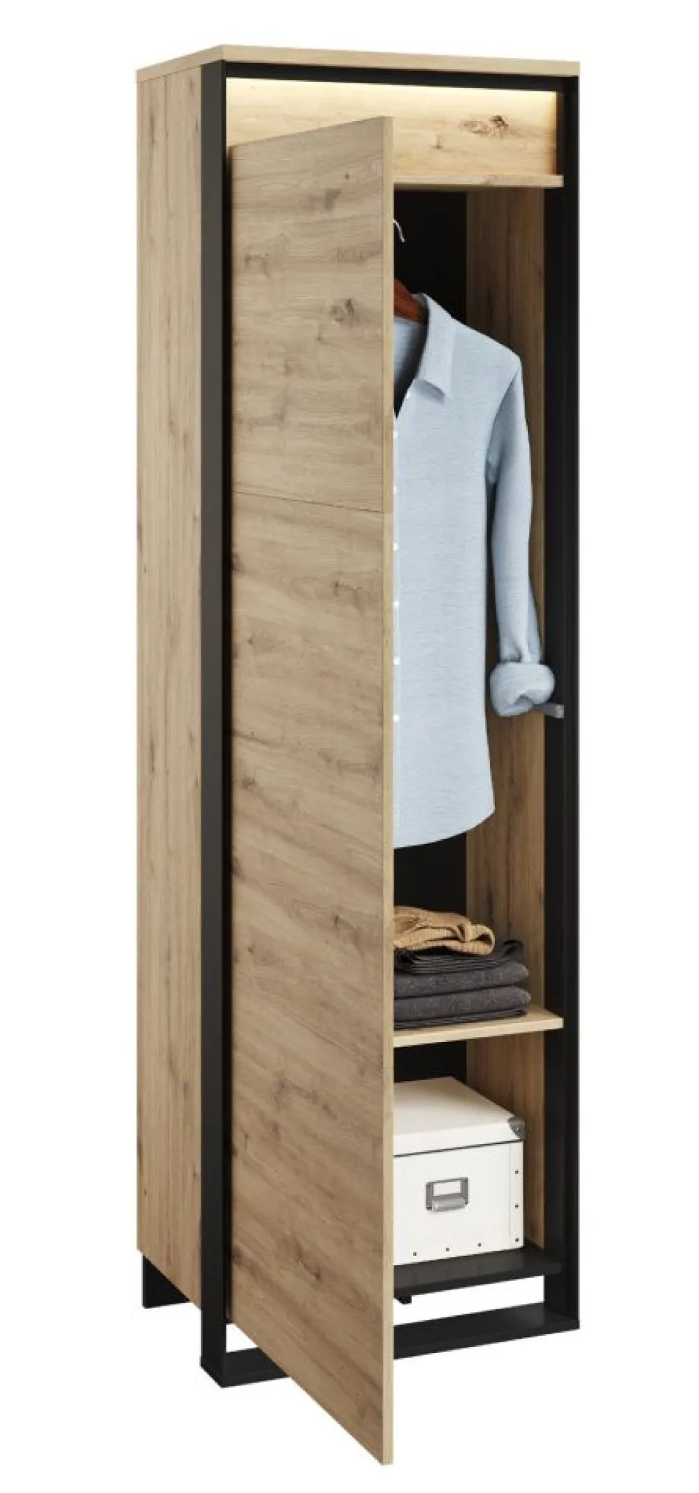 Ta garderoba nie tylko cieszy oko, ale także oferuje znakomitą organizację. Dwie półki i drążek na wieszaki zapewniają mnóstwo miejsca na przechowywanie odzieży, akcesoriów i innych przedmiotów. Przestrzenny styl frontów zostaje podkreślony za pomocą subtelnego oświetlenia LED, które nadaje meblowi niezwykłego blasku.