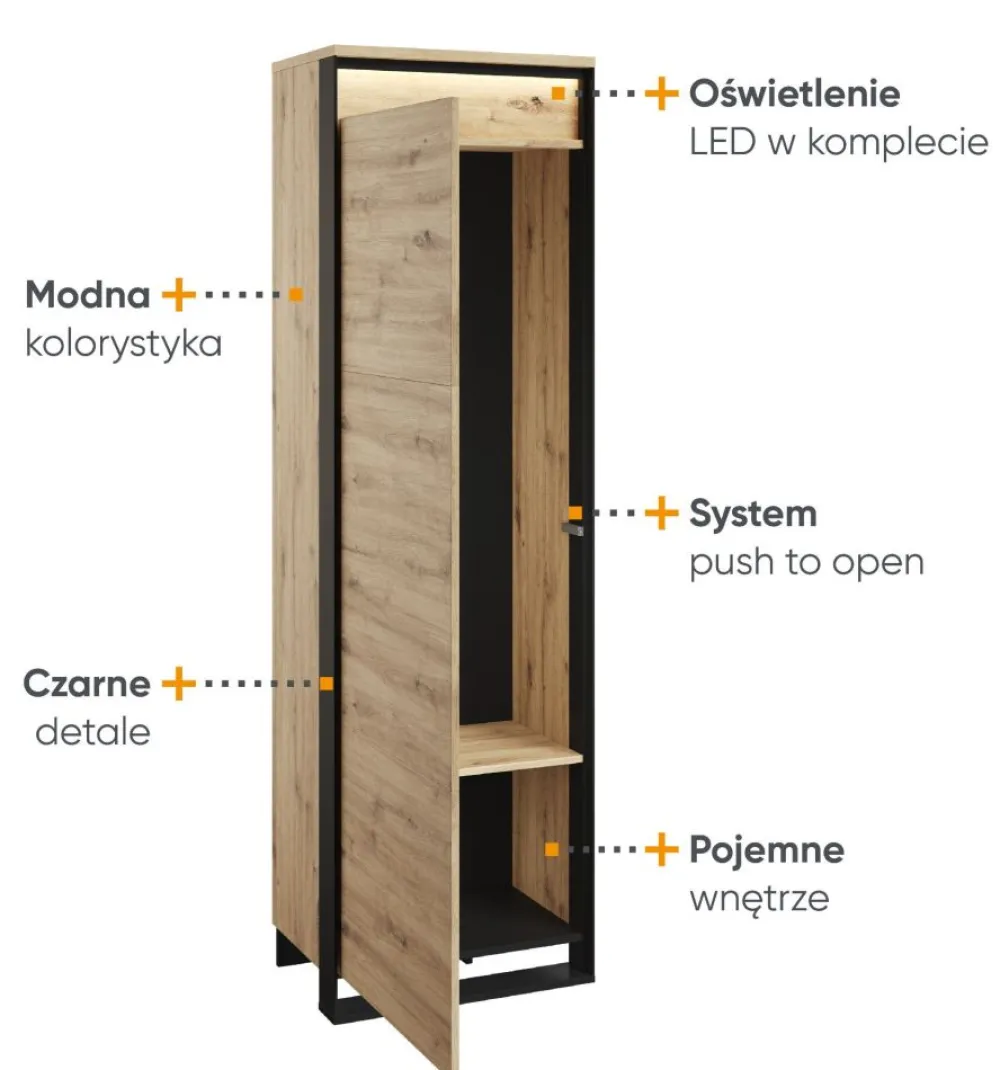 W tej szafie nie brakuje inteligentnych rozwiązań. Innowacyjny system push to open sprawia, że drzwi otwierają się płynnie i bez trudu, dodając nutę elegancji do codziennego użytkowania. Oświetlenie LED w komplecie tworzy atmosferę przytulności, podkreślając każdy element przechowywanych przedmiotów.
