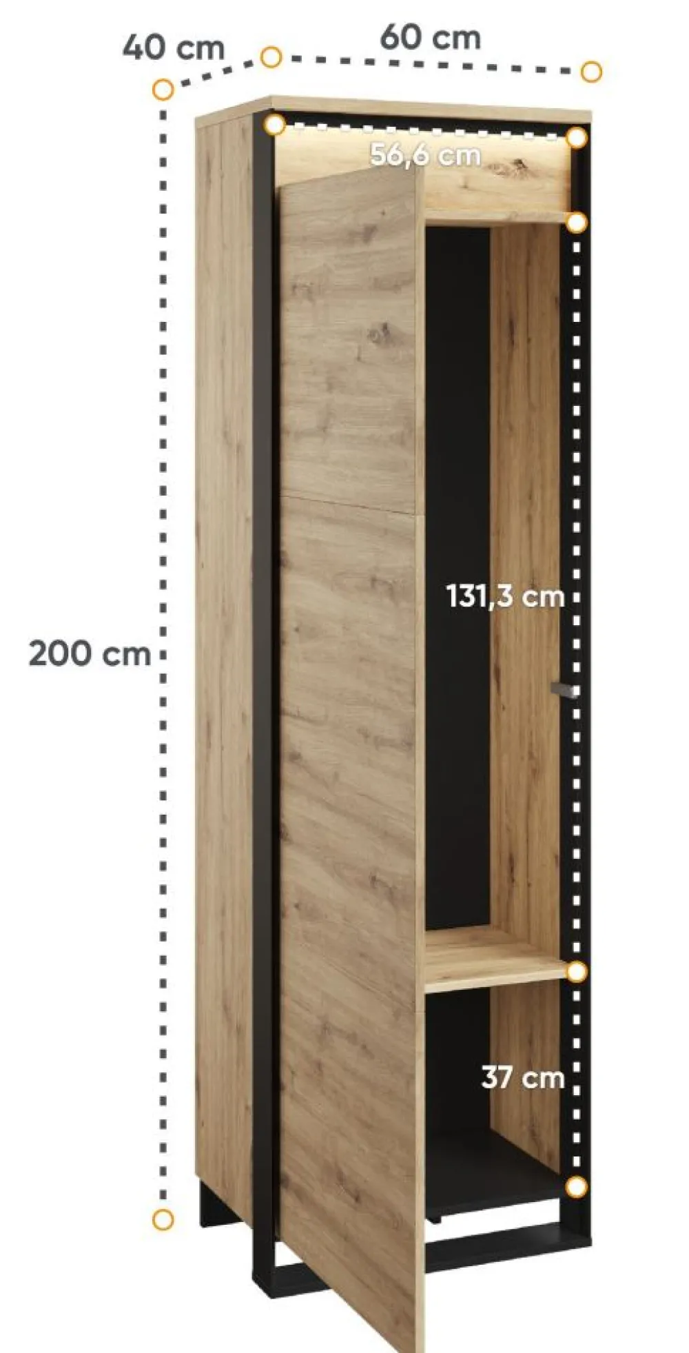 Szafa QUANT to połączenie solidności i stylu. Korpus wykonany z wysokiej jakości płyty wiórowej laminowanej w grubościach 16mm i 22mm gwarantuje trwałość i wytrzymałość. Kolorystyka czarnego korpusu i ciepłego dębu artisan na froncie tworzy efektowny kontrast, który ożywia przestrzeń.