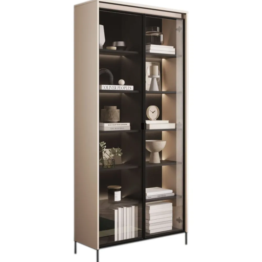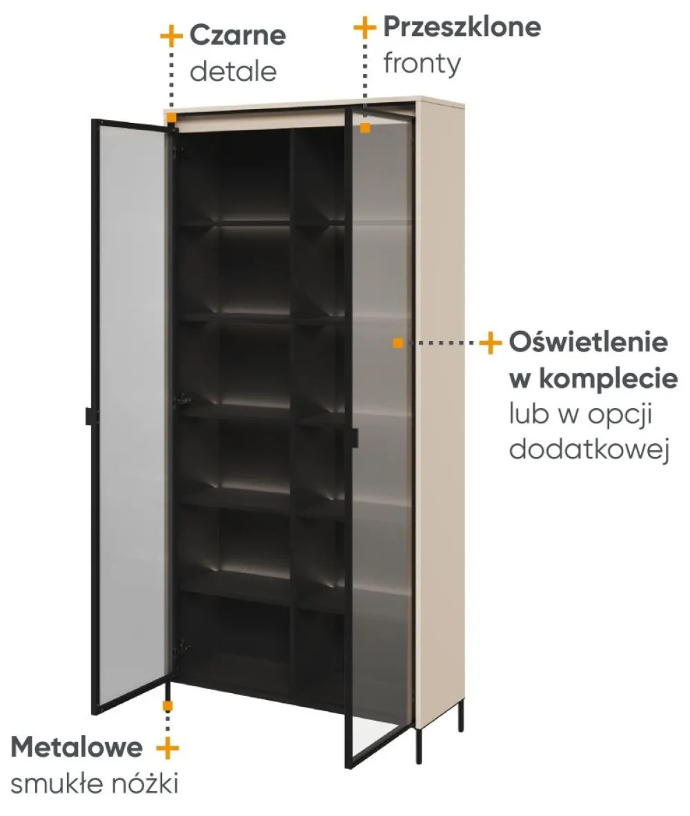 Witryna posiada 8 półek, które mogą wytrzymać obciążenie do 5 kg. Fronty witryny wykonane są z płyty MDF o grubości 18 mm, a ich frezowanie półwałkowe dodaje im eleganckiego wyglądu. Fronty przeszklone są wykonane ze szkła hartowanego o grubości 4 mm, nadającym meblowi lekkości. Czarna ramka metalowa frontu dodaje kontrastu i wyrazistości.