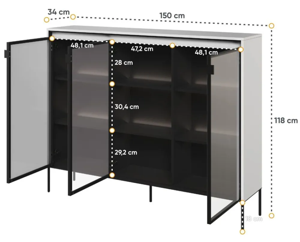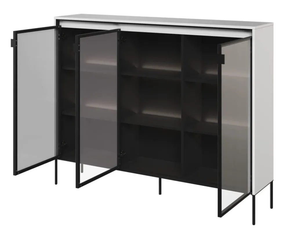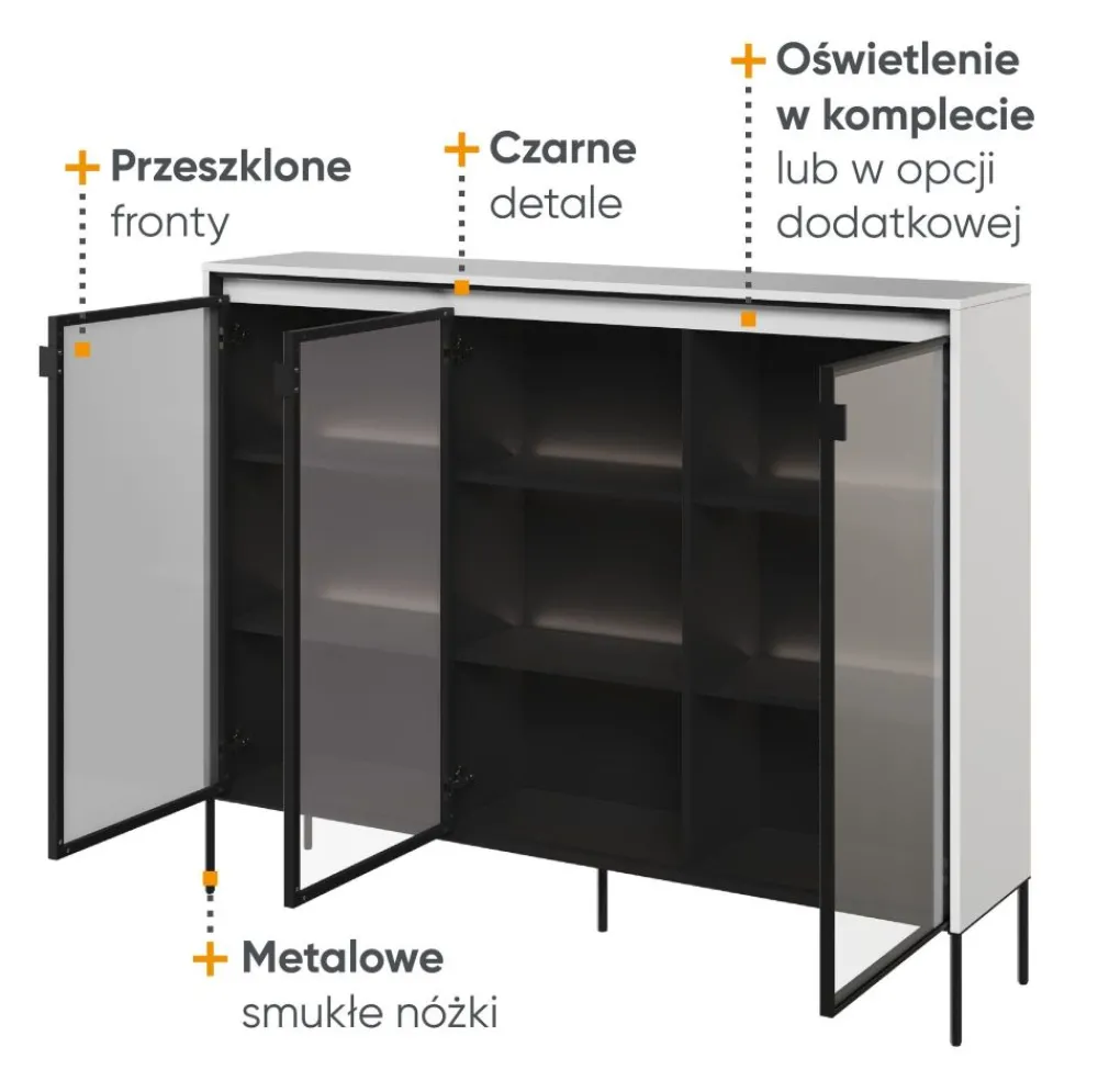 Szukasz niezwykłej komody, która przyciągnie uwagę i nada Twojemu wnętrzu wyjątkowego charakteru? Przeszklona komoda z kolekcji TREND spełni Twoje oczekiwania! To nie tylko mebel do przechowywania, ale również designerski element, który nadaje elegancji i stylu Twojemu salonowi. Dzięki przeszklonym frontom, komoda umożliwia prezentację ulubionych dekoracji, kolekcji książek, zastawy czy innych przedmiotów, które chcesz wyeksponować.