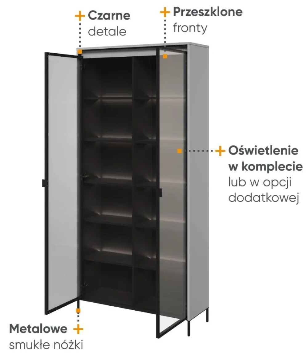 Ta wysoka witryna w stylu loft nie tylko spełni Twoje oczekiwania pod względem funkcjonalności, ale również stanie się nieodłącznym elementem dekoracyjnym Twojego wnętrza. Jej nowoczesny design, wysoka jakość wykonania i możliwość podświetlenia sprawią, że Twoje ulubione przedmioty będą prezentowane w najlepszym świetle. Wykorzystaj tę witrynę, aby nadać swojemu wnętrzu wyjątkowego charakteru i cieszyć się każdym spojrzeniem na piękno, które ją wypełnia.