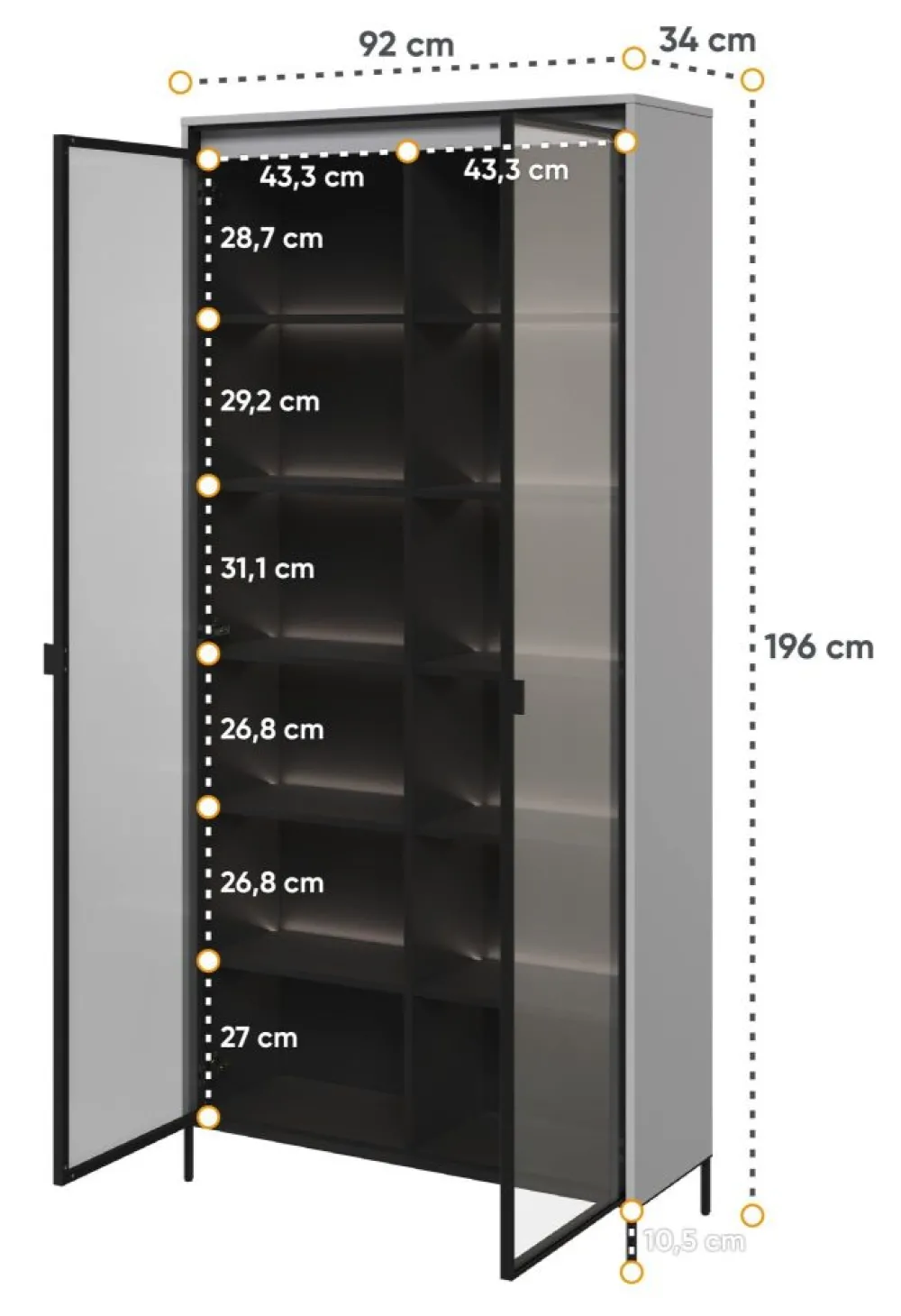 Witryna oferuje osiem przestronnych półek, na których z łatwością pomieścisz swoje ulubione przedmioty, pamiątki i dekoracje. Fronty witryny wykonane są z płyty MDF o grubości 18 mm, a przeszklone fronty z hartowanego szkła o grubości 4 mm dodają lekkości i podkreślają wyjątkowość prezentowanych przedmiotów.