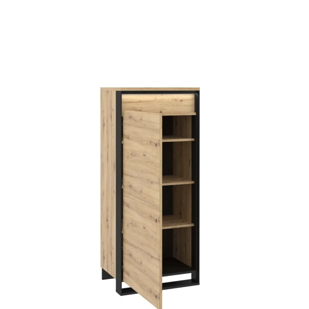 Kolekcja Quant zainspirowana stylem loft została unowocześniona na potrzeby dzisiejszych aranżacji. Czarne nogi tworzące jednocześnie obramowanie mebla to element wyróżniający kolekcję. Fronty mebli zostały wysunięte do przodu dzięki czemu tworzą efekt trójwymiarowości. Efektownym uzupełnieniem jest listwa z ledowym oświetleniem w cenie. Witryny z kolekcją mogą być dodatkowo uzupełnione o opcjonalne oświetlenie półek. Kolor dąb artisan i czerń to doskonałe połączenie do nowoczesnego loftu.