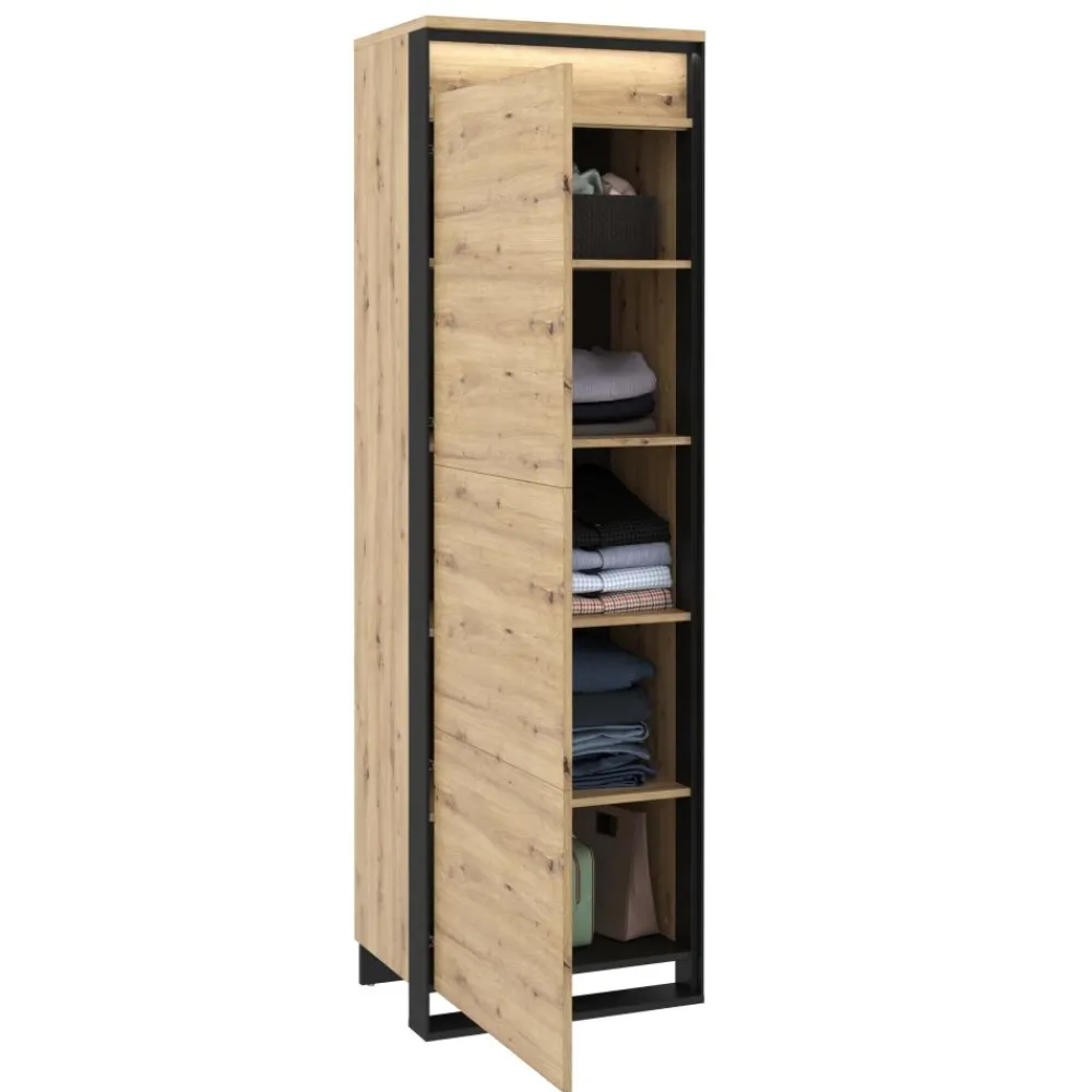 Szafa Quant wyposażona jest w wiele półek, dzięki czemu mebel znajdzie swoje miejsce w salonie, sypialni lub przedpokoju. Dodatkowym atutem jest ozdobne oświetlenie LED w górnej części szafy. Mebel wykonano z wytrzymałej płyty laminowanej wykończonej trwałym obrzeżem ABS. Komfortowe użytkowanie wspomaga mechanizm PUSH TO OPEN.