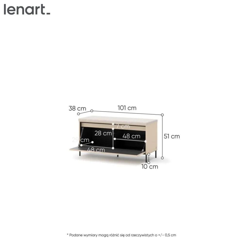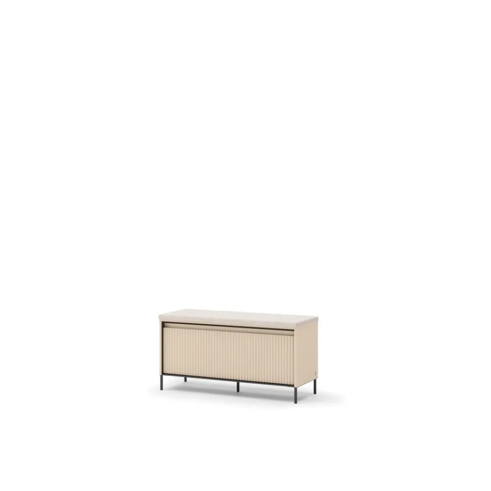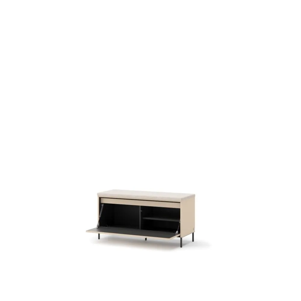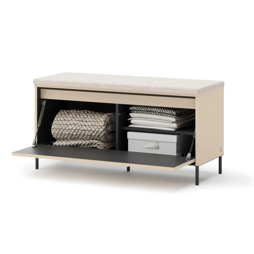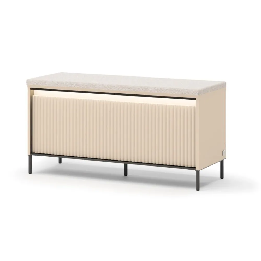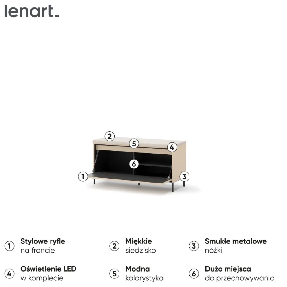 Szafka TG-05 z kolekcji TREND GARDEROBA to nowoczesna ławka na buty, która łączy minimalistyczny design z wysoką funkcjonalnością. Beż piaskowy kolor w zestawieniu z czarnymi akcentami idealnie komponuje się z nowoczesnymi aranżacjami wnętrz. Metalowe nóżki nadają konstrukcji lekkości, a jednocześnie zapewniają stabilność. Mebel został wyposażony w wygodne, tapicerowane siedzisko, które ułatwia codzienne zakładanie obuwia. Dzięki temu to idealne rozwiązanie zarówno dla dzieci, jak i osób starszych. Całość dopełnia nowoczesne oświetlenie LED w klasie energetycznej A++, które podkreśla charakter mebla i dodaje wnętrzu elegancji.
