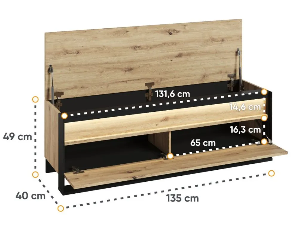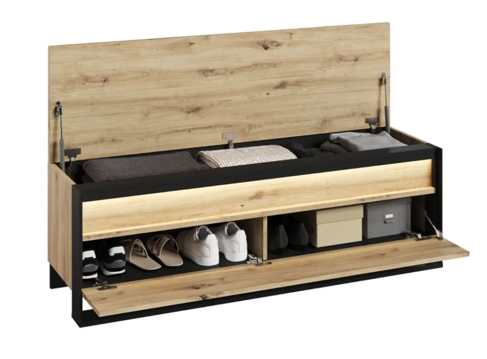 Szafka na buty QUANT została starannie wykonana z najwyższej jakości materiałów. Korpus z płyty wiórowej laminowanej zapewnia wyjątkową trwałość i solidność, co jest gwarancją, że mebel posłuży przez wiele lat. Kontrast między czarnym korpusem a ciepłym dębem artisan na froncie i blacie tworzy niepowtarzalne, piękne zestawienie kolorystyczne, które przyciąga wzrok i dodaje wnętrzu charakteru.