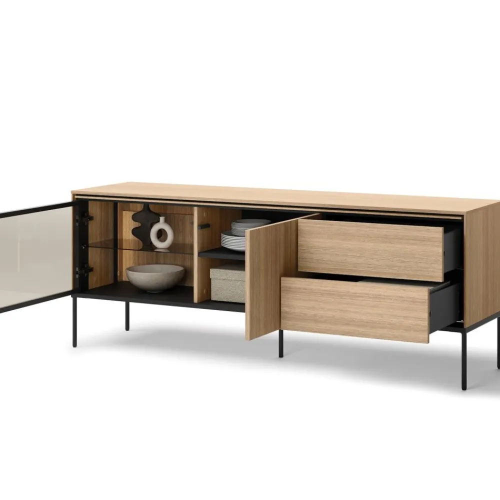 Szafka RTV VISSO VI-07 to mebel, który stanie się centralnym punktem Twojego salonu. Nowoczesny design z prostymi liniami i minimalistycznym wykończeniem doskonale wpasowuje się w różnorodne aranżacje, od skandynawskich po industrialne. Przestronne półki umożliwiają wygodne umieszczenie telewizora, odtwarzacza, konsoli i innych urządzeń, zapewniając wszystko w zasięgu ręki. Kolor dąb linearny dodaje wnętrzu ciepła i harmonii, czyniąc salon bardziej przytulnym. To idealny wybór dla osób, które szukają funkcjonalnego i eleganckiego rozwiązania do swojego salonu.