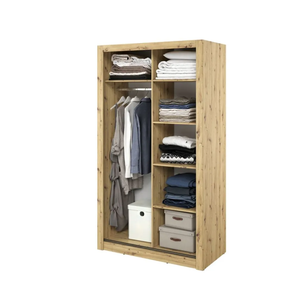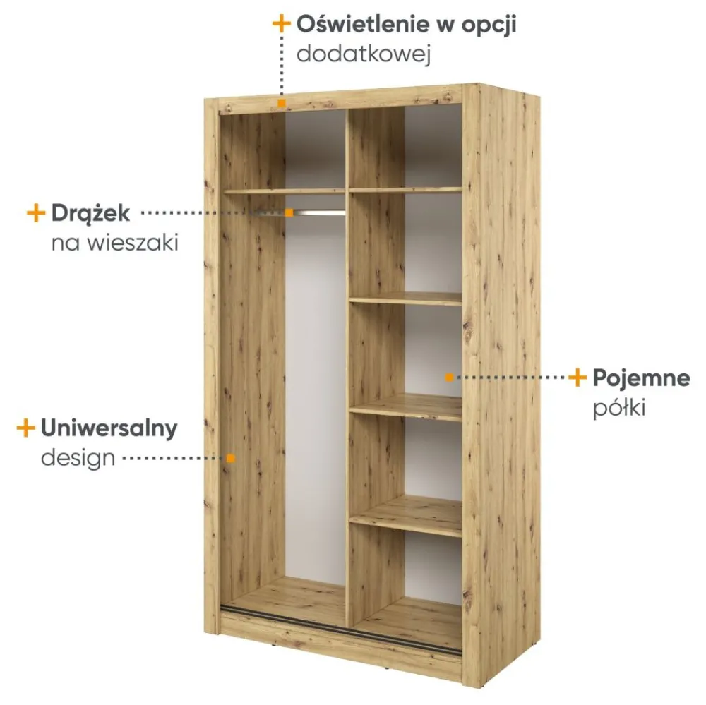 Dzięki swojej uniwersalności, szafa idealnie sprawdzi się w sypialni, garderobie czy przedpokoju. Doskonale dostosowuje się do różnych potrzeb, umożliwiając personalizację przestrzeni zgodnie z własnym gustem.
