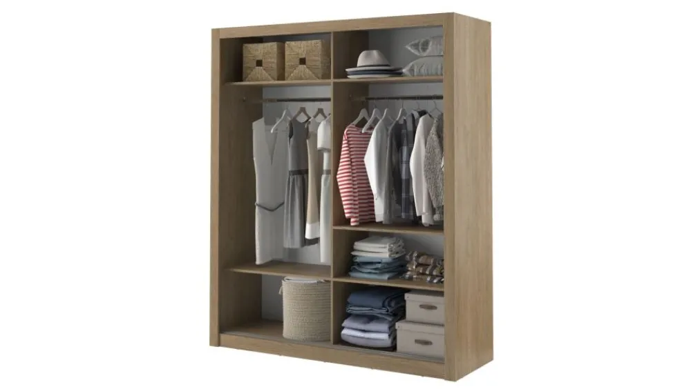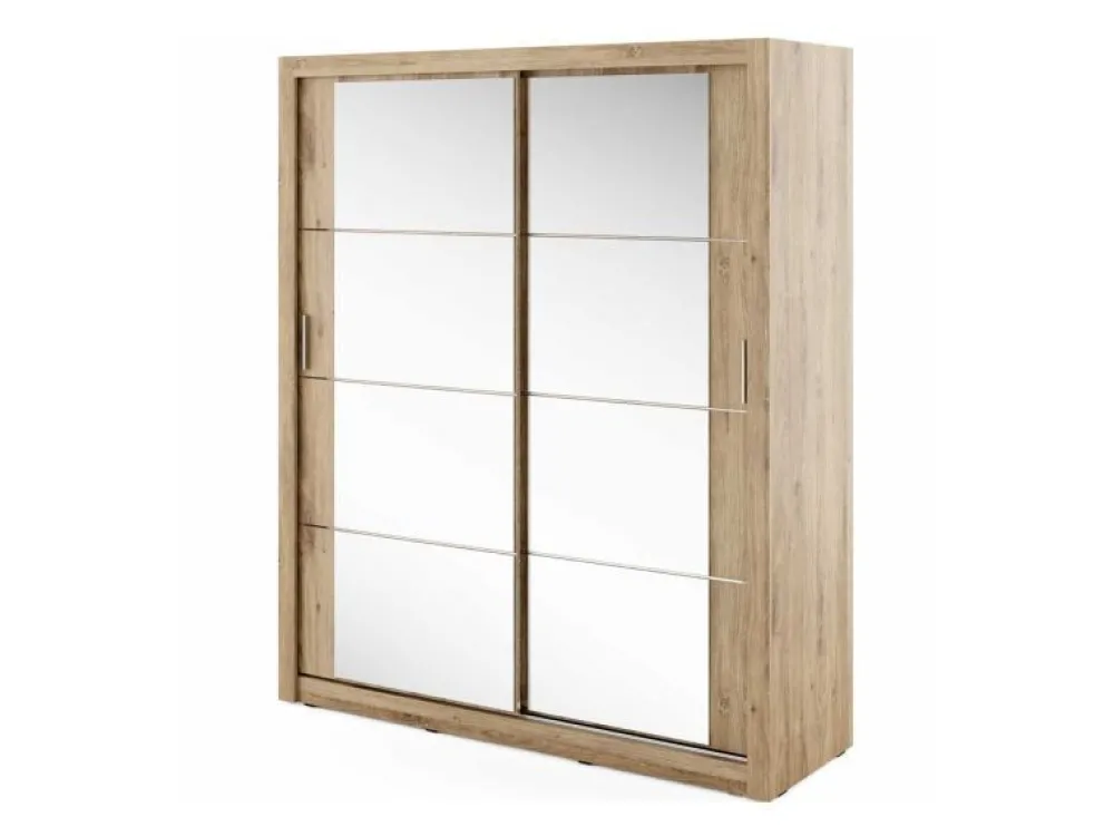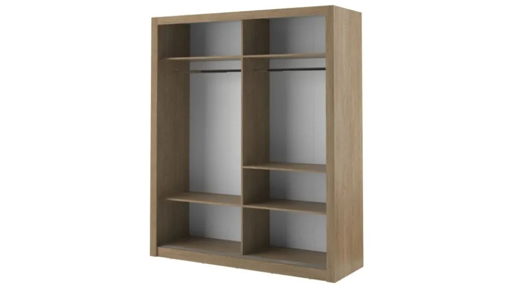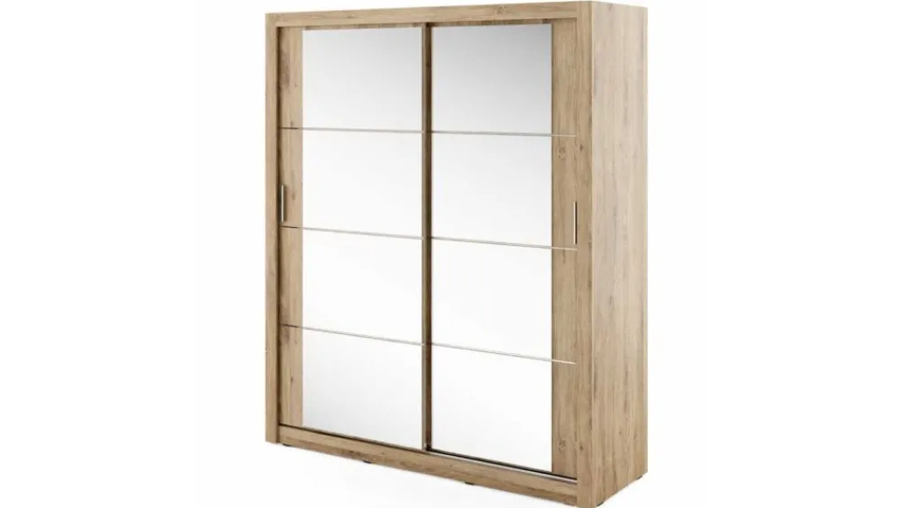 Pojemna szafa dwudrzwiowa z drzwiami przesuwnymi. Na froncie drzwi znajdują się praktyczne, duże lustra. Wewnątrz znajdują się dwa drążki do zawieszenia odzieży oraz pięć pojemnych półek, na których przechowasz pudełka, odzież czy bieliznę. Szafa dostępna jest w kilku wersjach kolorystycznych, dzięki czemu dopasujesz ją do wielu różnych wnętrz. Mebel wykonano z wytrzymałej płyty laminowanej z obrzeżami wzmocnionymi ABS.