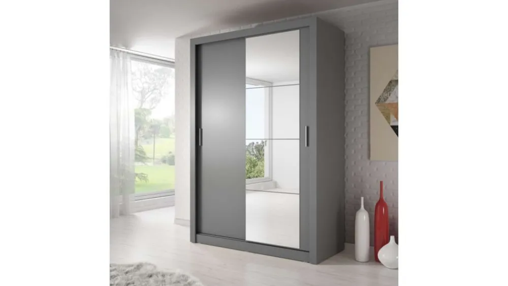 Wąska szafa dwudrzwiowa z drzwiami przesuwnymi. Na froncie drzwi znajduje się praktyczne, duże lustro. Wewnątrz umieszczono drążek do zawieszenia odzieży oraz sześć pojemnych półek, na których przechowasz pudełka, odzież czy bieliznę. Szafa dostępna jest w kilku wersjach kolorystycznych, dzięki czemu dopasujesz ją do wielu różnych wnętrz. Mebel wykonano z wytrzymałej płyty laminowanej z obrzeżami wzmocnionymi ABS.