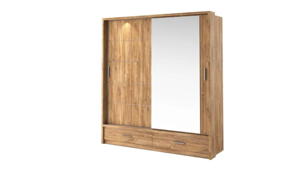 Szafa dwudrzwiowa z drzwiami przesuwnymi. Na froncie drzwi znajduje się praktyczne, duże lustro. Wewnątrz umieszczono dwa drążki do zawieszenia odzieży oraz sześć pojemnych półek, na których przechowasz pudełka, odzież czy bieliznę. Dodatkowo, w dolnej części szafy, znajdują się dwie łatwo dostępne szuflady na drobniejsze przedmioty. Szafa dostępna jest w kilku wersjach kolorystycznych, dzięki czemu dopasujesz ją do wielu różnych wnętrz. Mebel wykonano z wytrzymałej płyty laminowanej z obrzeżami wzmocnionymi ABS.
