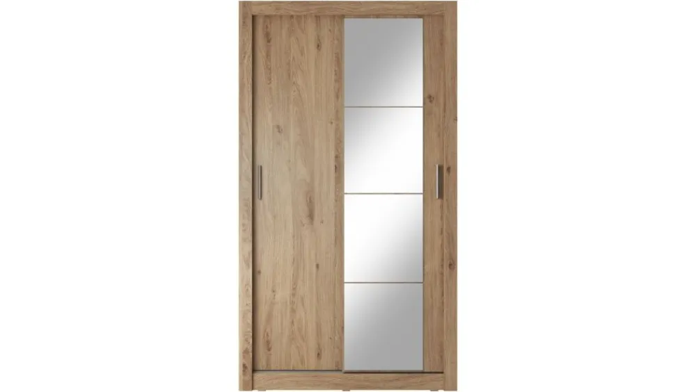 Wąska szafa dwudrzwiowa z drzwiami przesuwnymi. Na froncie drzwi znajduje się praktyczne, duże lustro. Wewnątrz umieszczono dwa drążki do zawieszenia odzieży oraz pięć pojemnych półek, na których przechowasz pudełka, odzież czy bieliznę. Szafa dostępna jest w kilku wersjach kolorystycznych, dzięki czemu dopasujesz ją do wielu różnych wnętrz. Mebel wykonano z wytrzymałej płyty laminowanej z obrzeżami wzmocnionymi ABS.