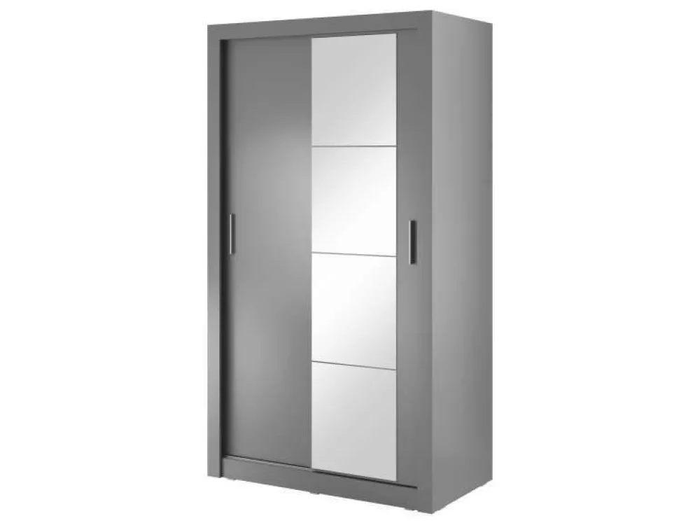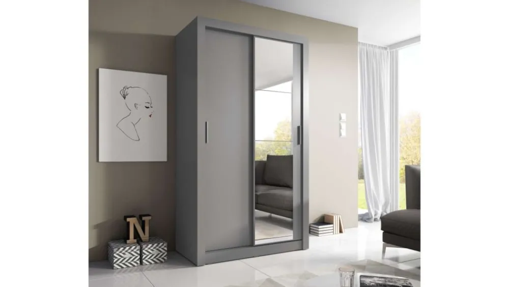 Wąska szafa dwudrzwiowa z drzwiami przesuwnymi. Na froncie drzwi znajduje się praktyczne, duże lustro. Wewnątrz umieszczono dwa drążki do zawieszenia odzieży oraz pięć pojemnych półek, na których przechowasz pudełka, odzież czy bieliznę. Szafa dostępna jest w kilku wersjach kolorystycznych, dzięki czemu dopasujesz ją do wielu różnych wnętrz. Mebel wykonano z wytrzymałej płyty laminowanej z obrzeżami wzmocnionymi ABS oraz trwałej płyty MDF.