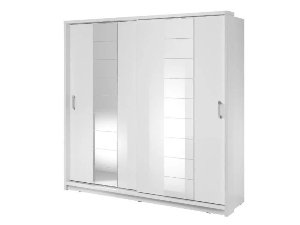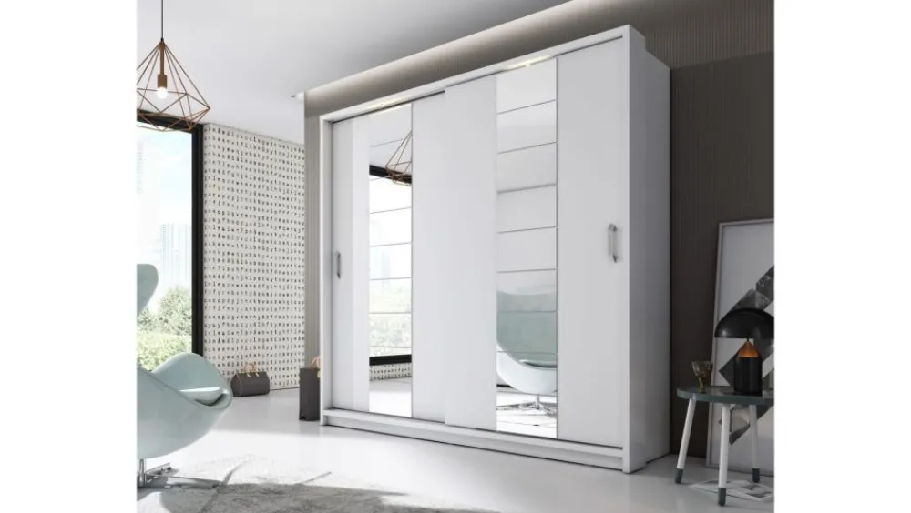 Szafa dwudrzwiowa z drzwiami przesuwnymi. Na froncie drzwi znajdują się praktyczne, duże lustra. Wewnątrz umieszczono dwa drążki do zawieszenia odzieży oraz dwa regały z rzędem pojemnych półek, na których przechowasz pudełka, odzież czy bieliznę. Dodatkowo, w górnej części szafy, znajdują się kolejne półki, na których przechowasz odzież sezonową lub rzadziej używane przedmioty. Szafa dostępna jest w kilku wersjach kolorystycznych, dzięki czemu dopasujesz ją do wielu różnych wnętrz. Mebel wykonano z wytrzymałej płyty laminowanej z obrzeżami wzmocnionymi ABS.