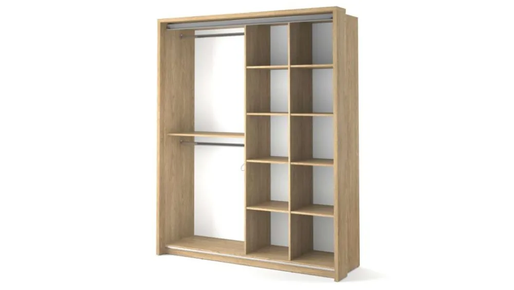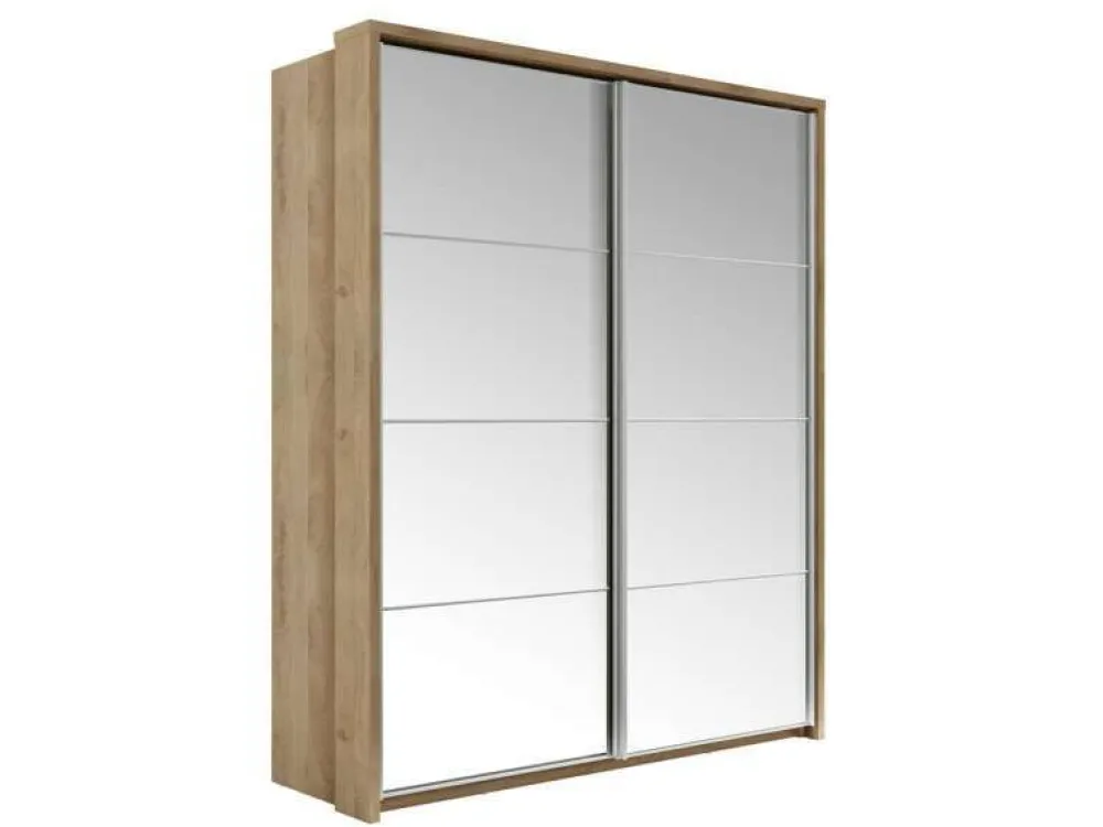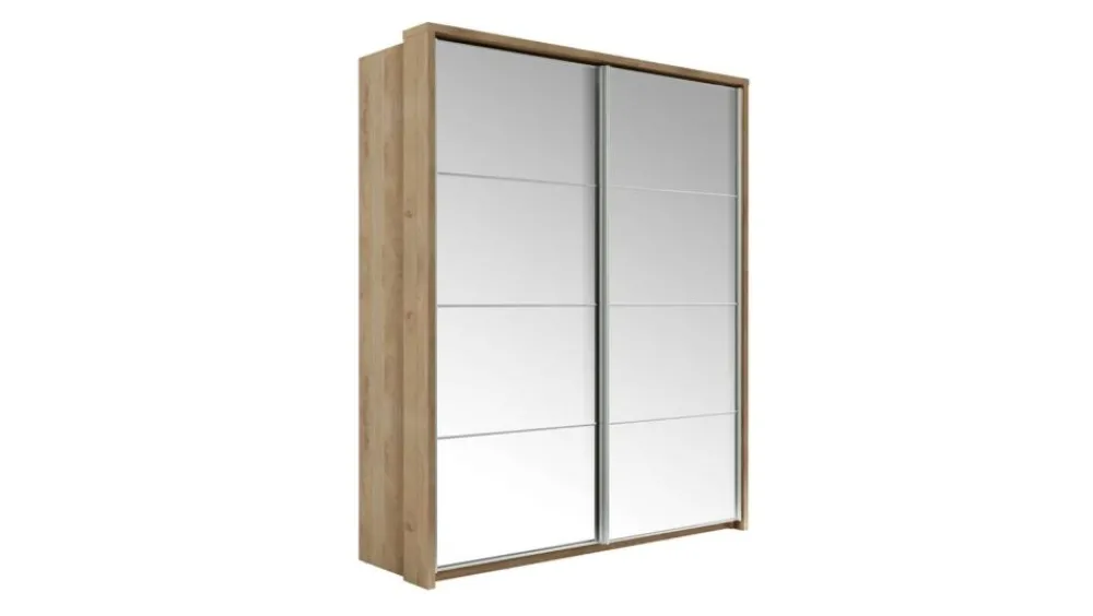 Szafa dwudrzwiowa z drzwiami przesuwnymi. Na froncie drzwi znajdują się praktyczne, duże lustra. Wewnątrz umieszczono trzy drążki do zawieszenia odzieży oraz regał z rzędem pojemnych półek, na których przechowasz pudełka, odzież czy bieliznę. Dodatkowo, w górnej części szafy, znajduje się kolejna półka, na której przechowasz odzież sezonową lub rzadziej używane przedmioty. Szafa dostępna jest w kilku wersjach kolorystycznych, dzięki czemu dopasujesz ją do wielu różnych wnętrz. Mebel wykonano z wytrzymałej płyty laminowanej z obrzeżami wzmocnionymi ABS.