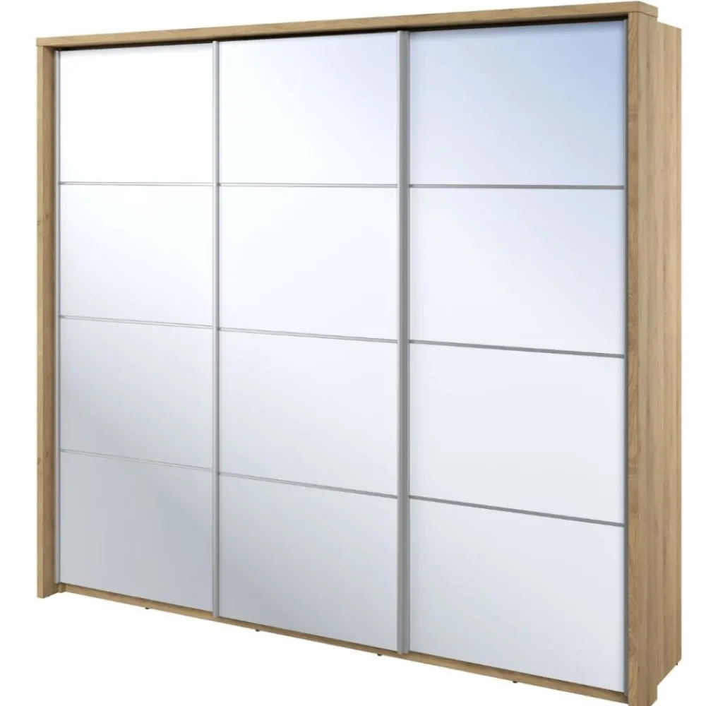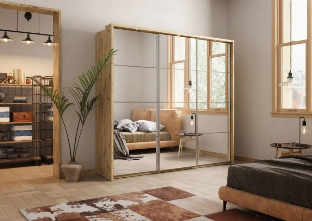 Szukasz przestronnego i eleganckiego rozwiązania do przechowywania swojej garderoby? Ta trzydrzwiowa szafa w kolorze dąb shetland z lustrami na froncie to idealny wybór. Łączy w sobie stylowy wygląd, funkcjonalność i wysoką jakość wykonania. To nie tylko praktyczny mebel, ale także efektowny element wystroju, który podkreśli charakter Twojej sypialni.