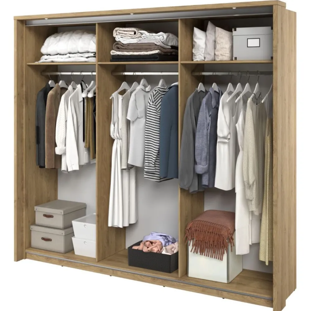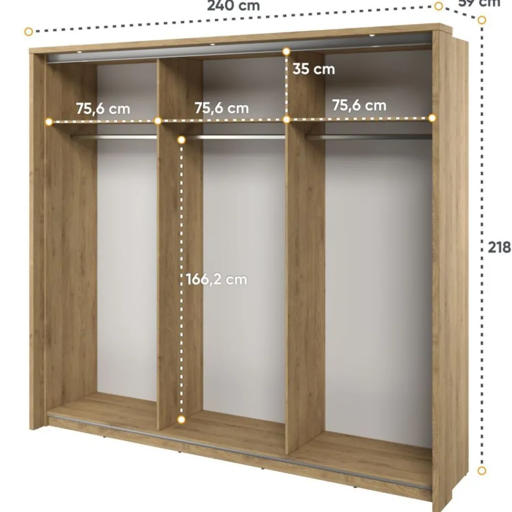 Odkryj wnętrze szafy, gdzie półki i drążki na wieszaki zostały zaprojektowane z myślą o optymalnej organizacji, umożliwiając Ci utrzymanie porządku w każdym detalu. W szafie znajdują się półki idealne do przechowywania koszul, swetrów czy akcesoriów. Znajdziesz także dwa solidne drążki na wieszaki, idealne do zawieszenia koszul, marynarek czy sukienek. Dają one możliwość zorganizowania garderoby według własnych preferencji.
