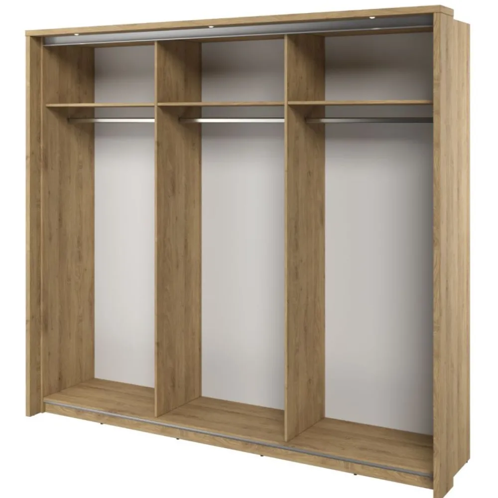 Szafa została wyposażona w praktyczne lustra na frontach, co nie tylko dodaje jej elegancji, ale również ułatwia ostatnie poprawki w stroju przed wyjściem. Lustra optycznie powiększają przestrzeń, co sprawia, że wnętrze wydaje się większe i jaśniejsze.