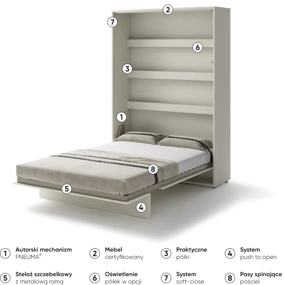 W codziennym użytkowaniu liczy się wygoda i poczucie kontroli. Półkotapczan BED CONCEPT został wyposażony w pneumatyczne podnośniki, które sprawiają, że otwieranie i zamykanie jest płynne oraz niemal bezwysiłkowe. System soft close zapewnia ciche domykanie frontu – bez trzasków i gwałtownych ruchów. Wzmocniony korpus montowany do ściany gwarantuje stabilność całej konstrukcji. Ten półkotapczan pionowy został zaprojektowany tak, abyś mogła korzystać z niego codziennie – komfortowo i bezpiecznie.