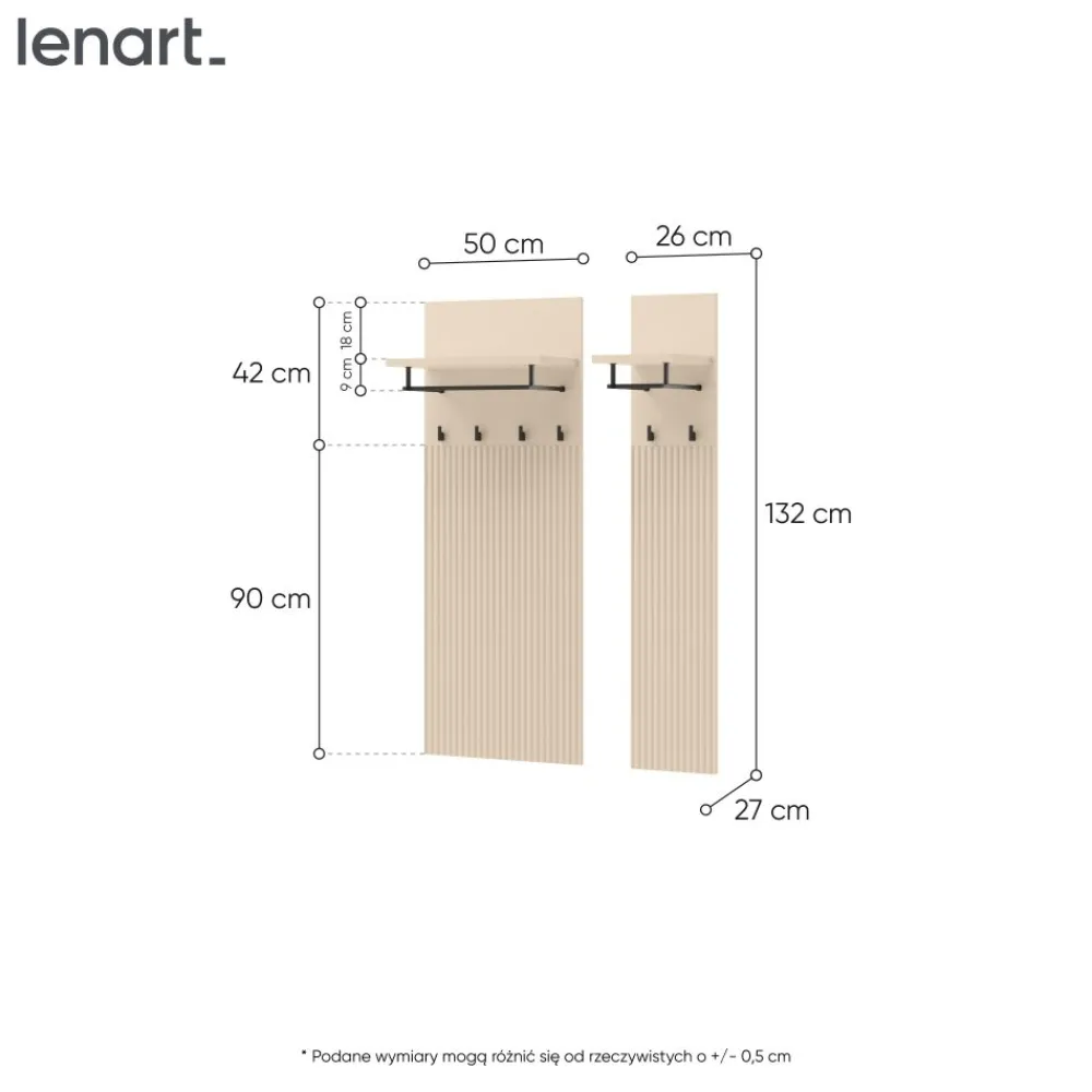 Wieszak na ubrania Lenart TREND TG-06 to mebel, który łączy trwałość wykonania z prostotą codziennego użytkowania. Dzięki swojej konstrukcji, pozwala na szybki dostęp do najczęściej noszonych kurtek, płaszczy czy szalików. Został wykonany z płyty wiórowej laminowanej o grubości 16 mm, co zapewnia odporność na uszkodzenia mechaniczne i łatwość w pielęgnacji. Jego uniwersalny beżowy kolor doskonale wpasowuje się w różnorodne aranżacje przedpokoju czy garderoby. Prosty montaż i minimalistyczna forma sprawiają, że mebel ten jest funkcjonalnym i ponadczasowym wyborem. To idealny wieszak do przedpokoju dla tych, którzy szukają praktycznych, a zarazem eleganckich rozwiązań.