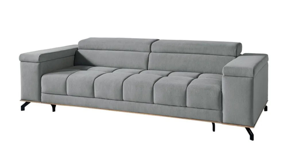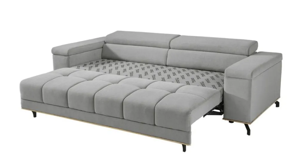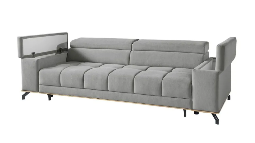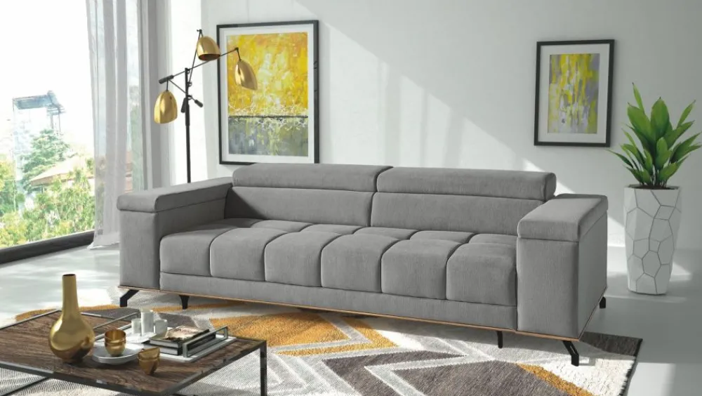Model Party to zdecydowanie propozycja do współczesnych wnętrz. Szerokie boczki, niższa konstrukcja oraz wysokie nóżki to elementy wskazujące na wysoki poziom nowoczesności. Niespotykane gdzie indziej nóżki oraz stylowa listwa ozdobna nadaje kanapie niepowtarzalnego wyglądu. Zagłówki z regulacją wysokości umożliwiają perfekcyjne dopasowanie wysokości, dzięki czemu poprawią komfort użytkowania. Wysokość kanapy: 74-95cm. Przeszycia i pikowane siedzisko to zdecydowanie nawiązanie do najnowszych trendów meblarskich. Ciekawostką są pojemniki na pościel umieszczone w szerokich boczkach mebla. Zastosowana funkcja spania – typu puma, uniemożliwia zwykle zastosowanie pojemnika. Dzięki zastosowaniu pojemników w boczkach, zyskujemy funkcjonalne pojemniki bez negatywnego wpływu na ogólny wygląd mebla. Zastosowana funkcja spania umożliwia komfortowy sen.