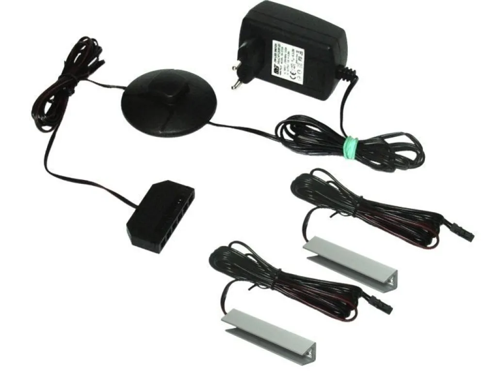 Oświetlenie LED typu klips do półek szklanych. Kolor światła – biały ciepły. W skład zestawu wchodzi: 2x klips LED 12V DC 0,3W dł. 5 cm z kablem dł. 2 m, zasilacz wtyczkowy z wyłącznikiem nożnym i kablem zasilającym o dł. 3 m.