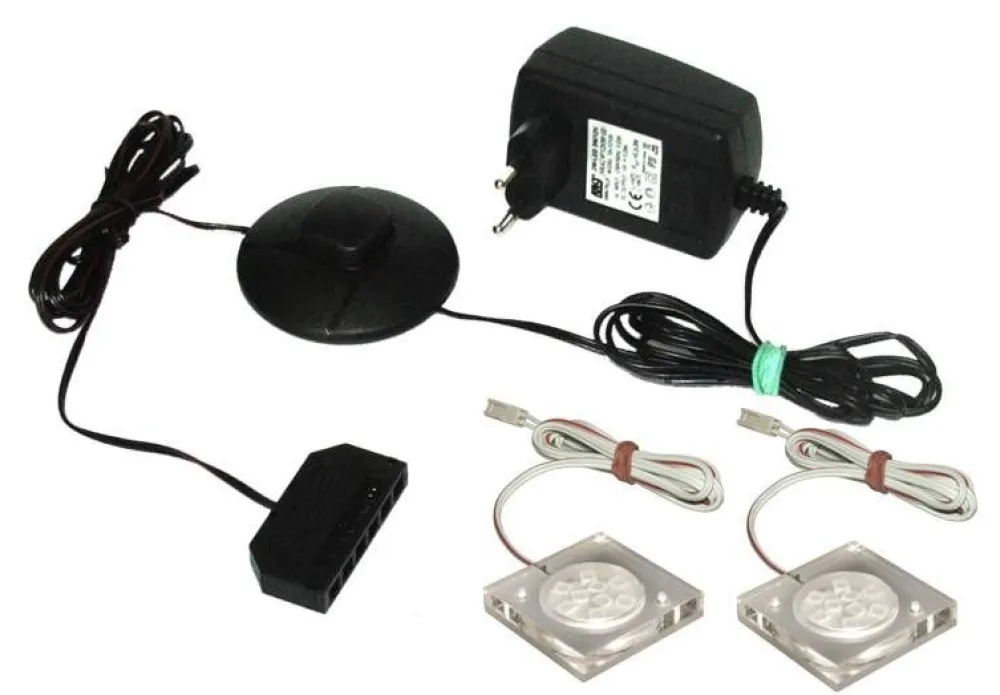 W skład zestawu wchodzi oprawa LED STIK 50F/T z akrylu, moc: 1,5W 12V DC – 9 LED – 2 szt, kolor światła: biały ciepły,