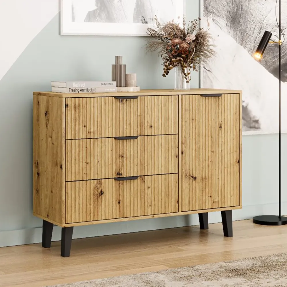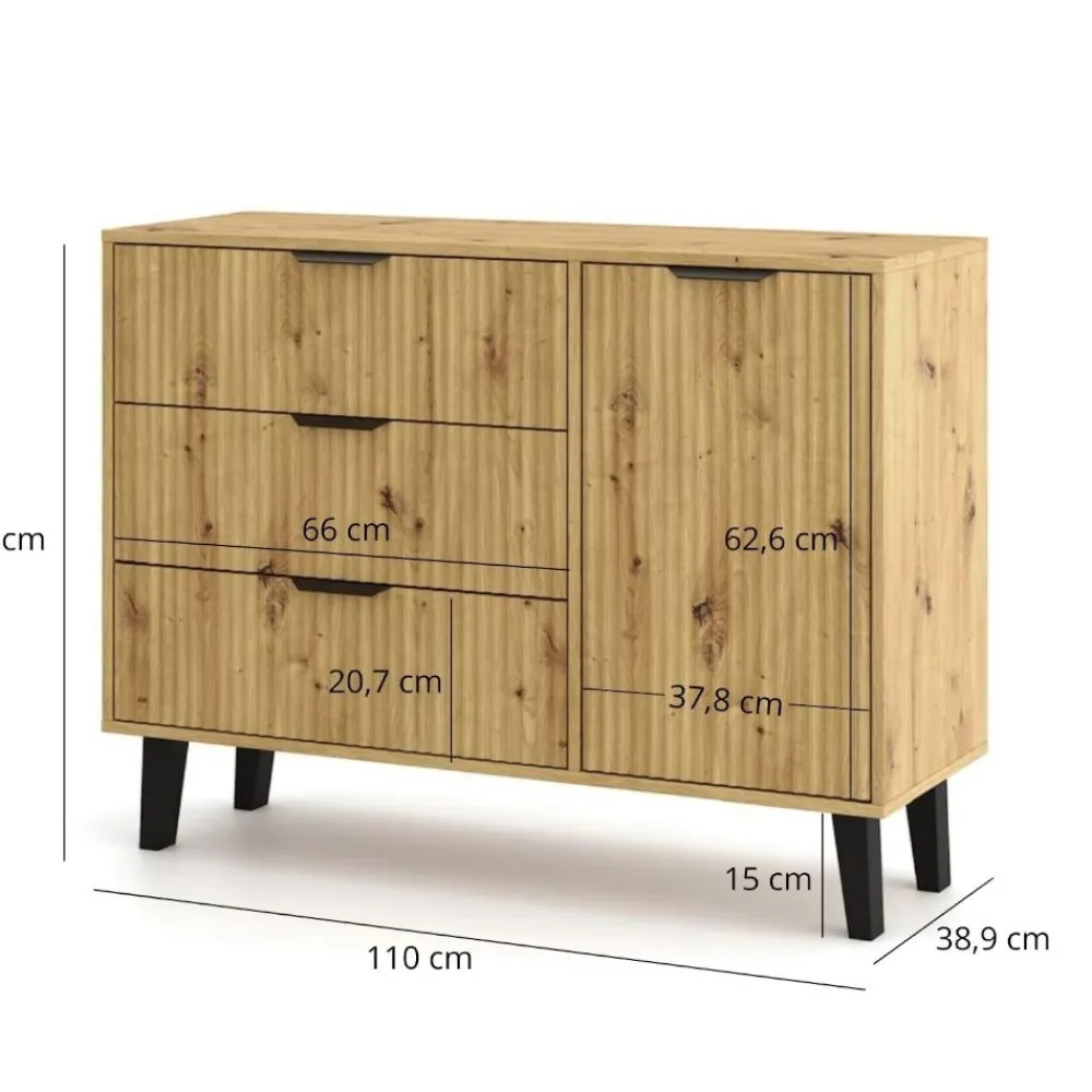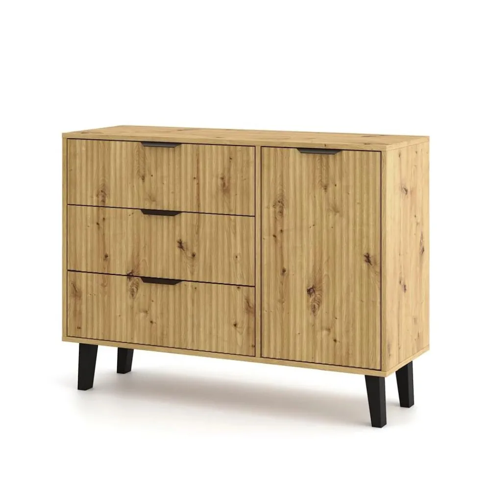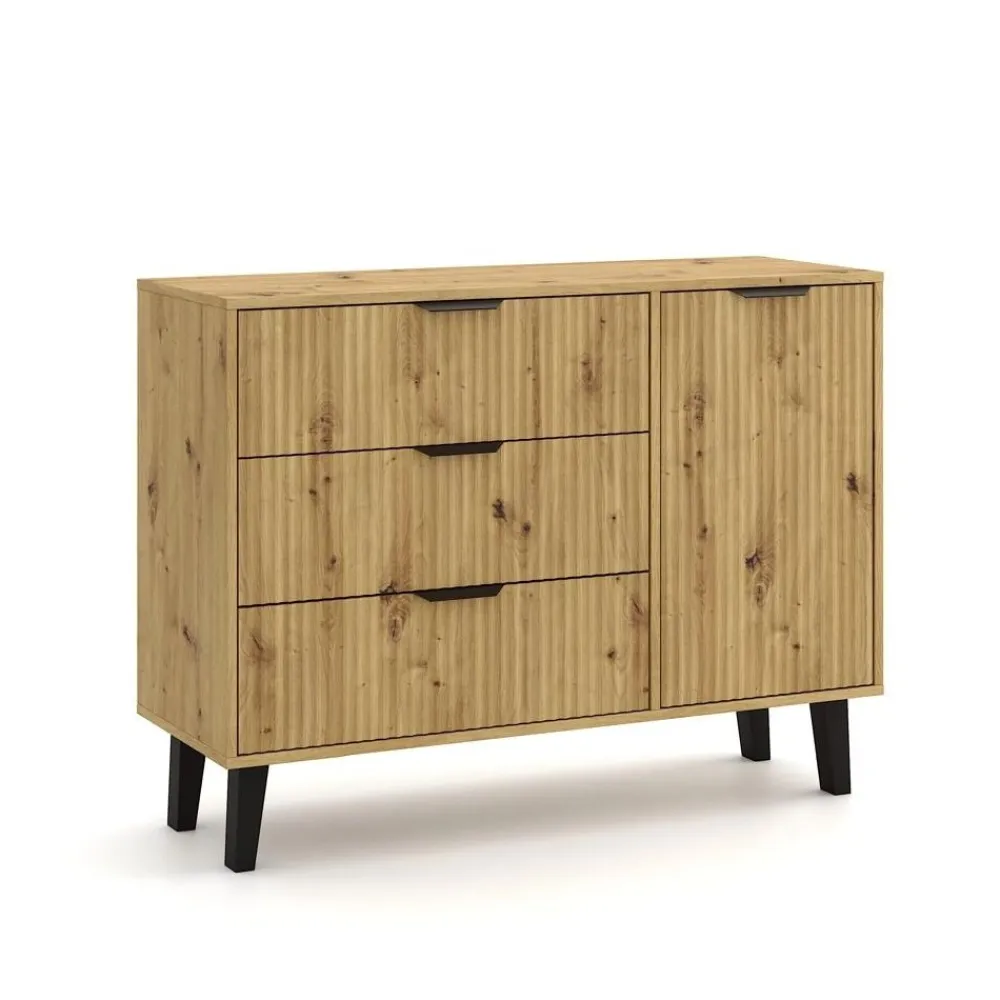 Jednym z flagowych elementów kolekcji jest duża komoda 1D3S, która oferuje imponującą ilość miejsca do przechowywania – idealna do sypialni, salonu czy przedpokoju. Przemyślany układ szafek i szuflad zapewnia wygodę i porządek w codziennym użytkowaniu.